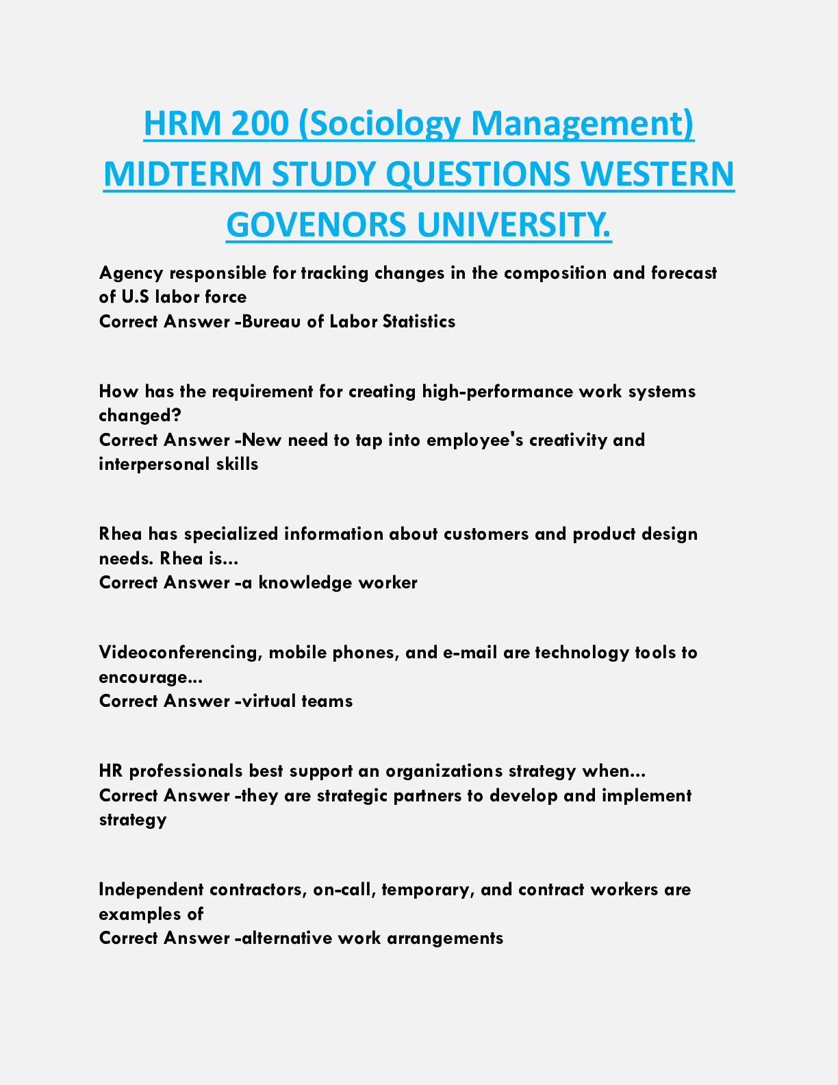 Human Resource Management > EXAM > HRM 200 (Sociology Management) MIDTERM STUDY QUESTIONS WESTERN GOVENORS UNIVERSITY. (All)