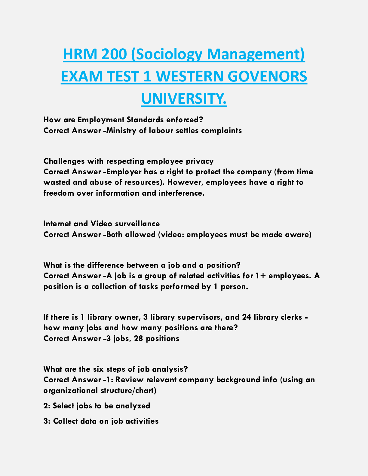 Human Resource Management > EXAM > HRM 200 (Sociology Management) EXAM TEST 1 WESTERN GOVENORS UNIVERSITY. (All)