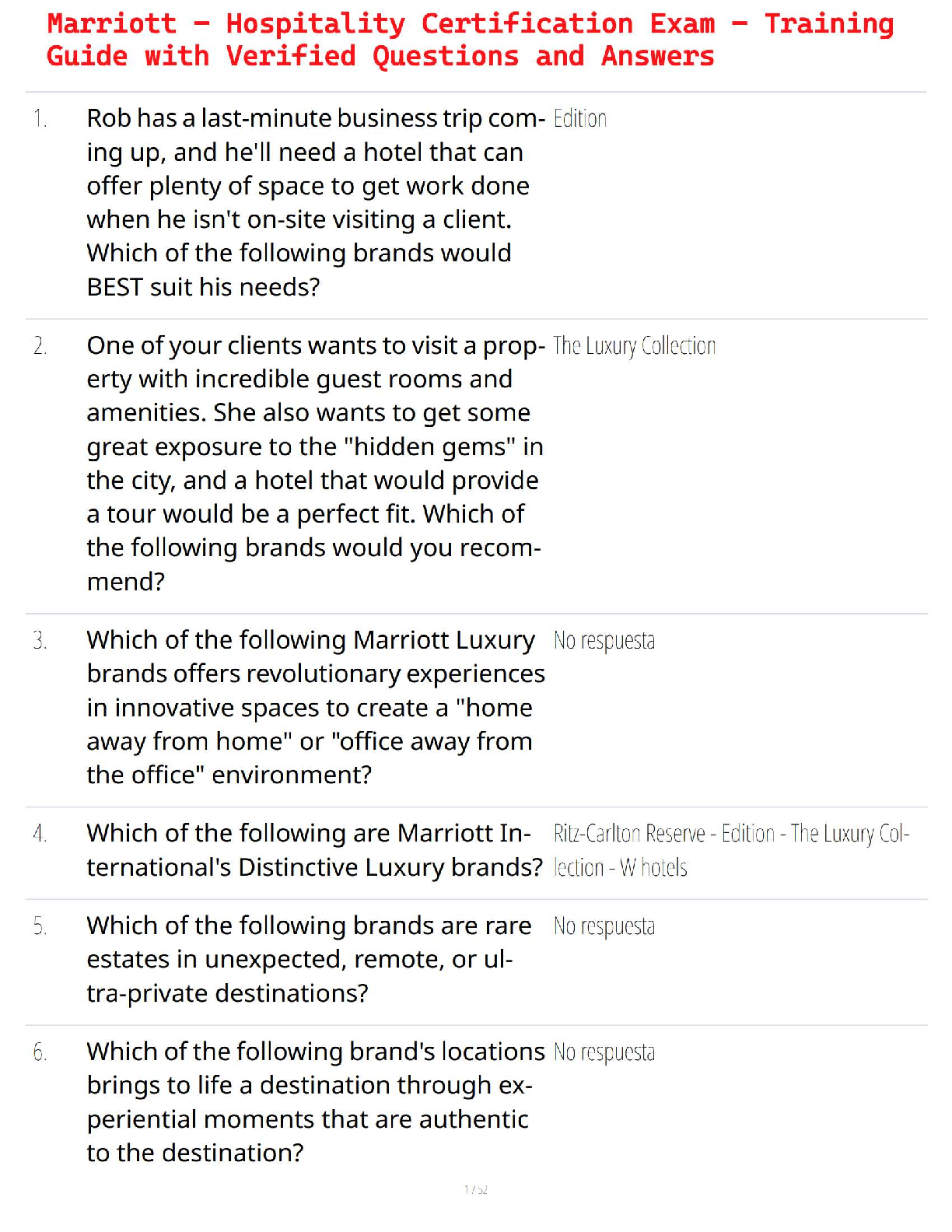 Human Resource Management > EXAM > Marriott – Hospitality Certification Exam – Training Guide with Verified Questions and Answers (All)