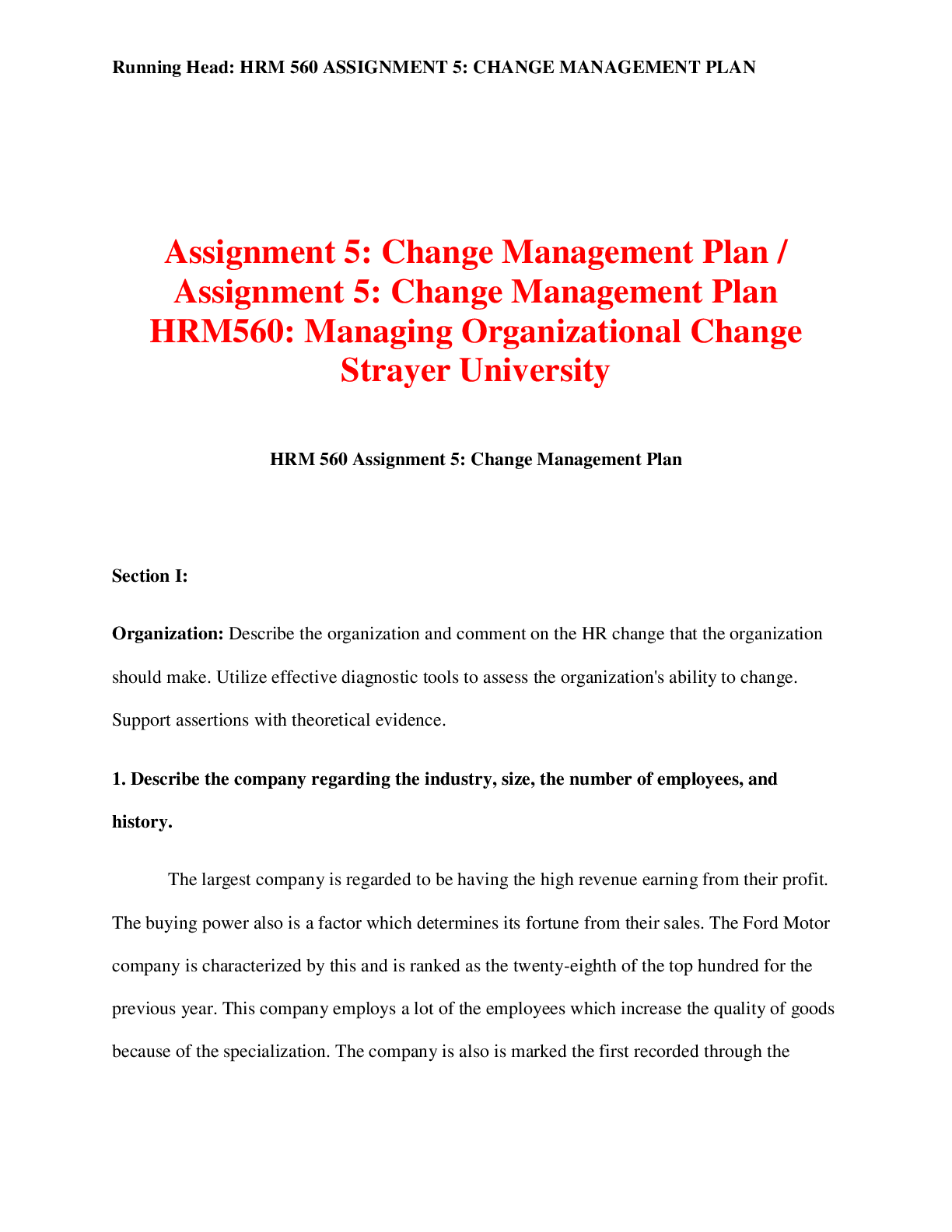 Human Resource Management > ESSAY > Assignment 5: Change Management Plan / Assignment 5: Change Management Plan HRM560: Managing Organizational Change Strayer University (All)