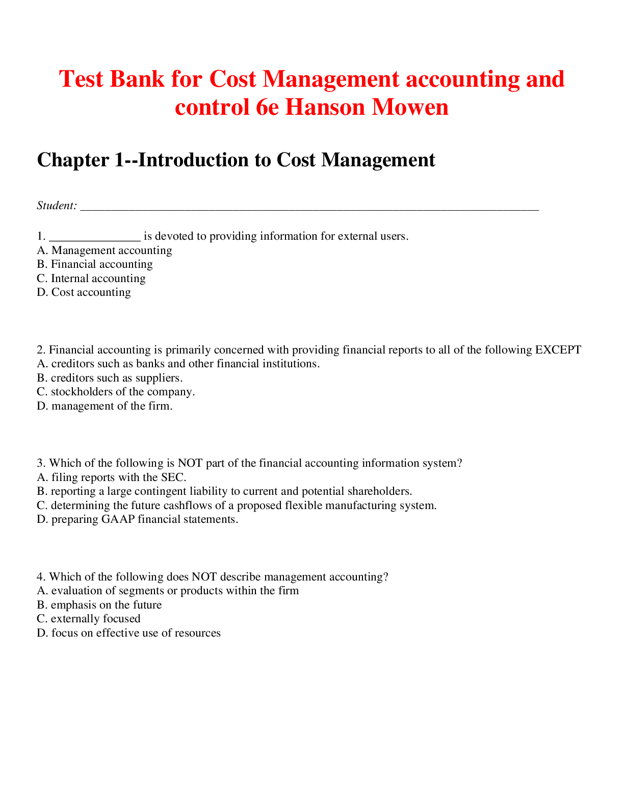 Financial Accounting > TEST BANKS > Cost Management accounting and control 6e Hanson Mowen (Test Bank ) (All)