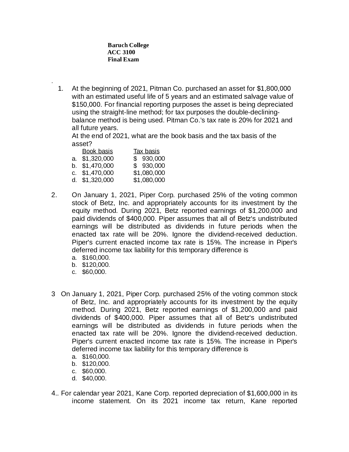 Financial Accounting > QUESTION PAPER (QP) > Baruch College ACC 3100 Final Exam. 35 Questions (All)