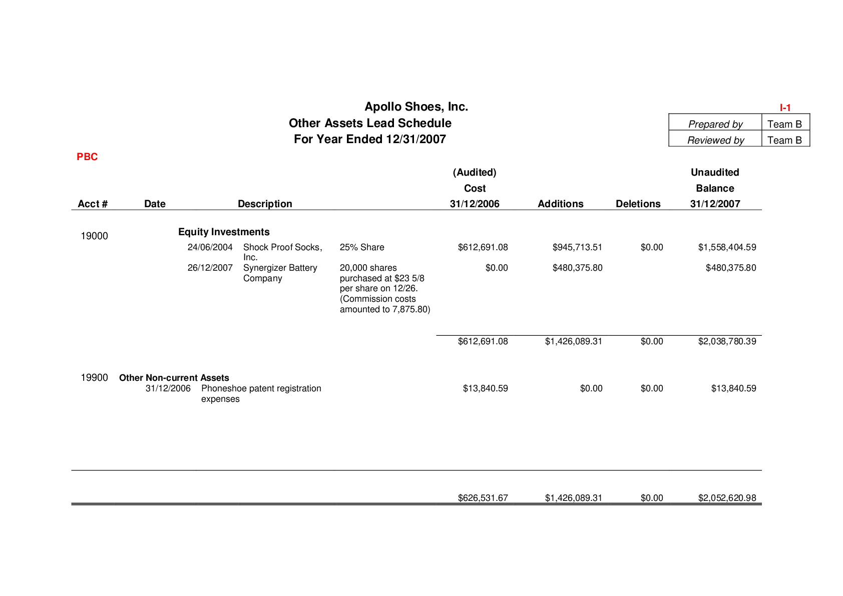 Financial Accounting > CASE STUDY > Apollo Shoes, Inc. I-1 Other Assets Lead Schedule (All)