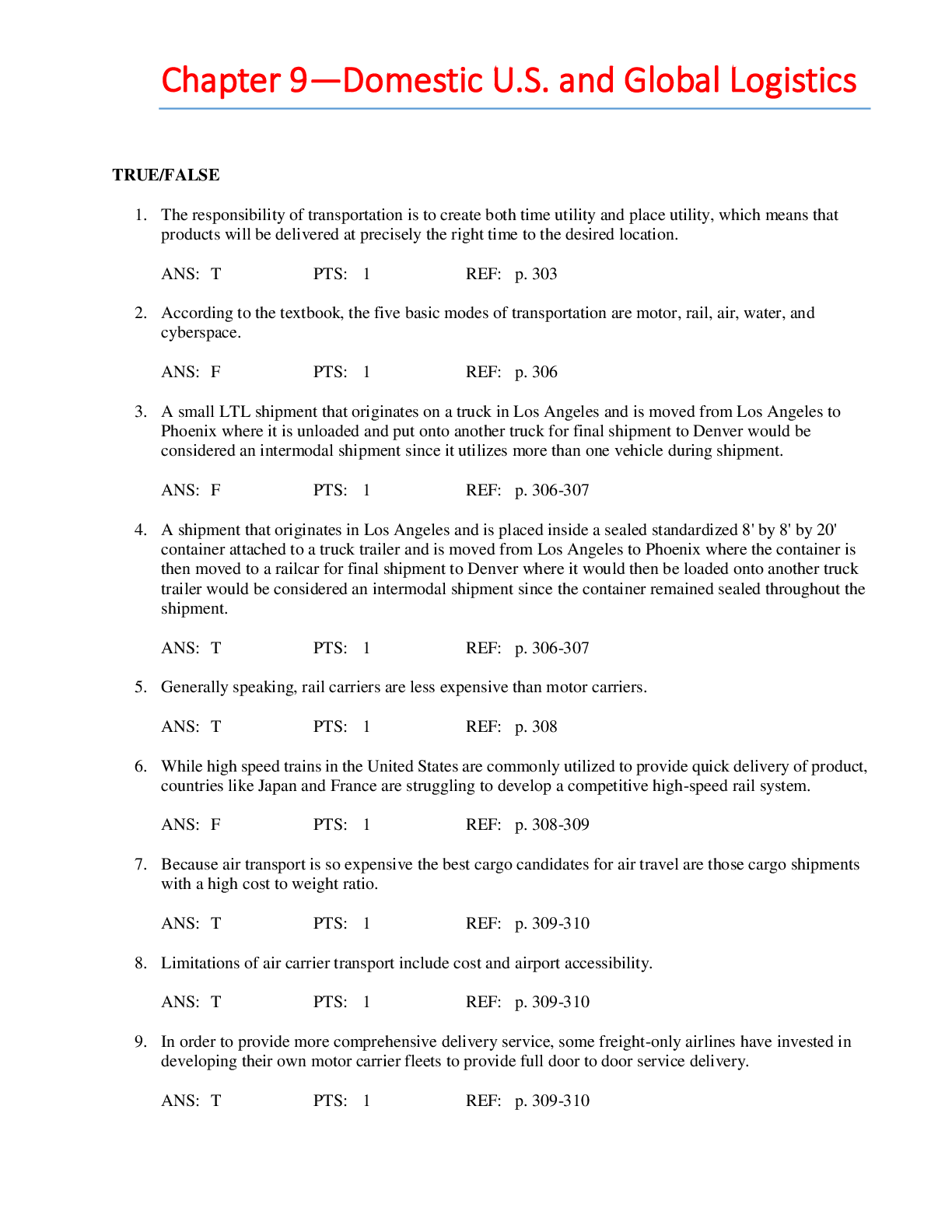 Financial Accounting > QUESTIONS & ANSWERS > Chapter 9—Domestic U.S. and Global Logistics. Questions and Answers. (All)