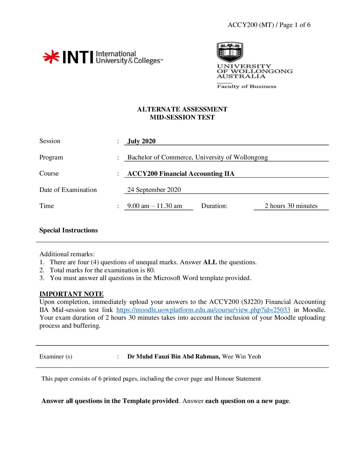 Financial Accounting > EXAM > University of Wollongong ACCY 112 ACCY 200 Mid term (questions) (All)