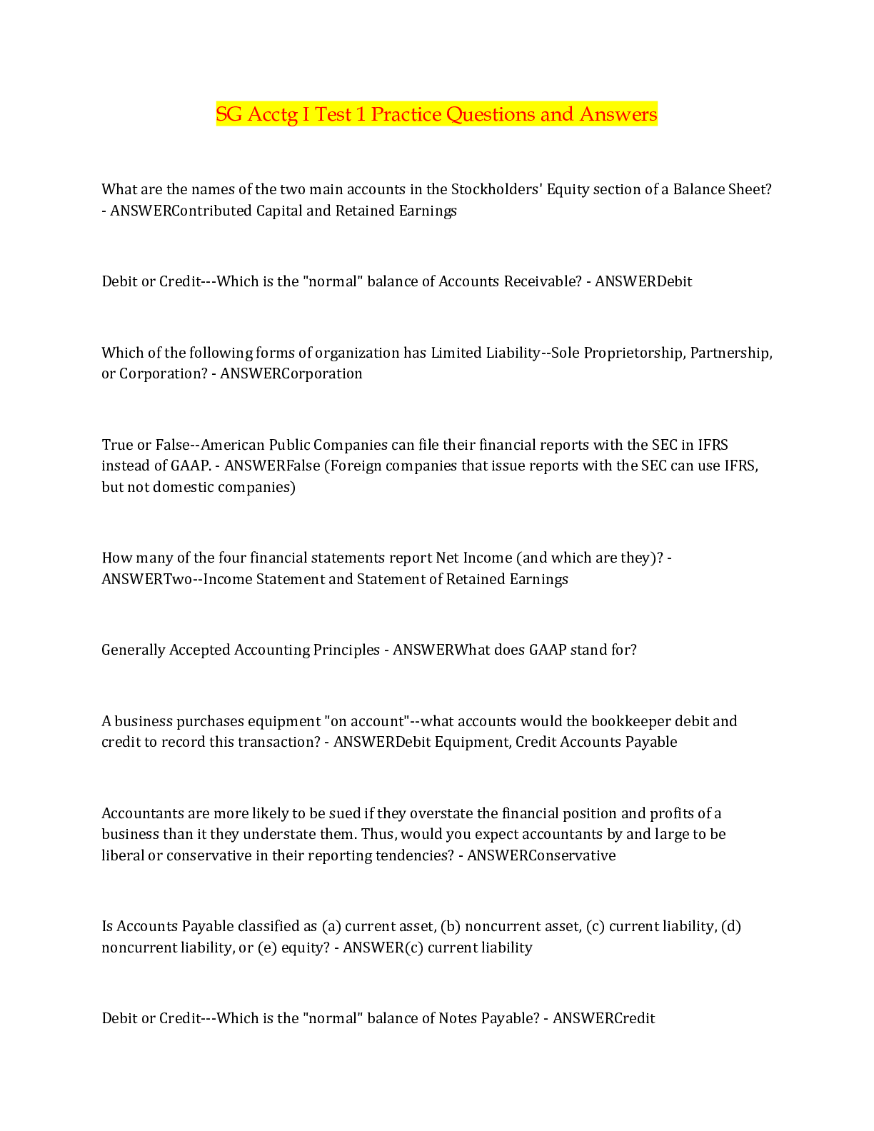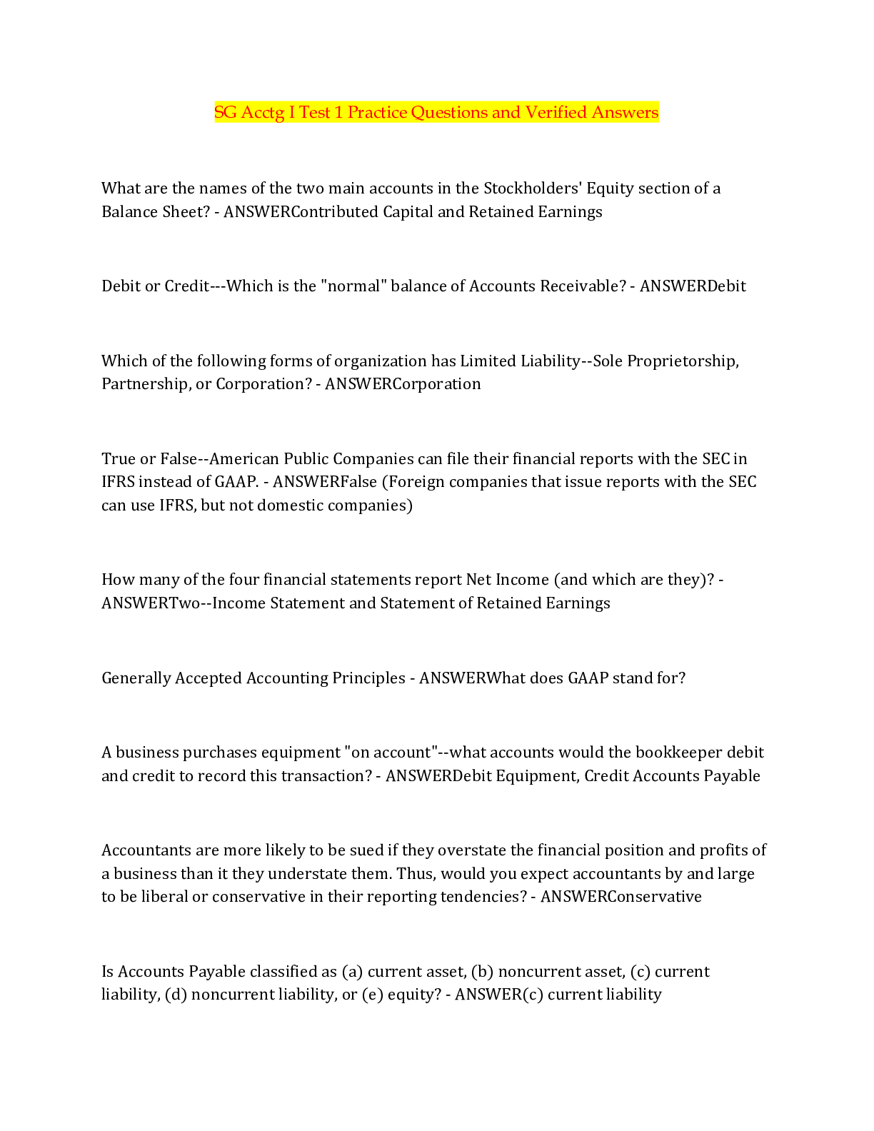 Financial Accounting > QUESTIONS & ANSWERS > SG Acctg I Test 1 Practice Questions and Answers (All)