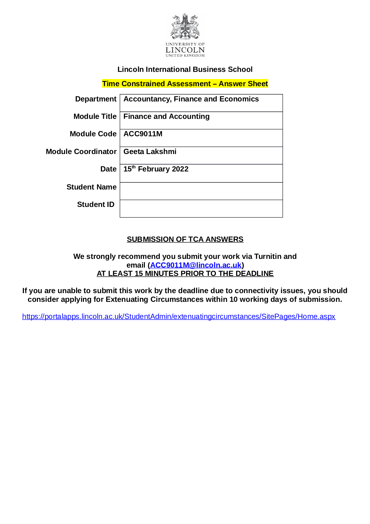 Financial Accounting > EXAMs > ACC9011M TCA Answer Sheet Accountancy, Finance and Economics Title Finance and Accounting (All)