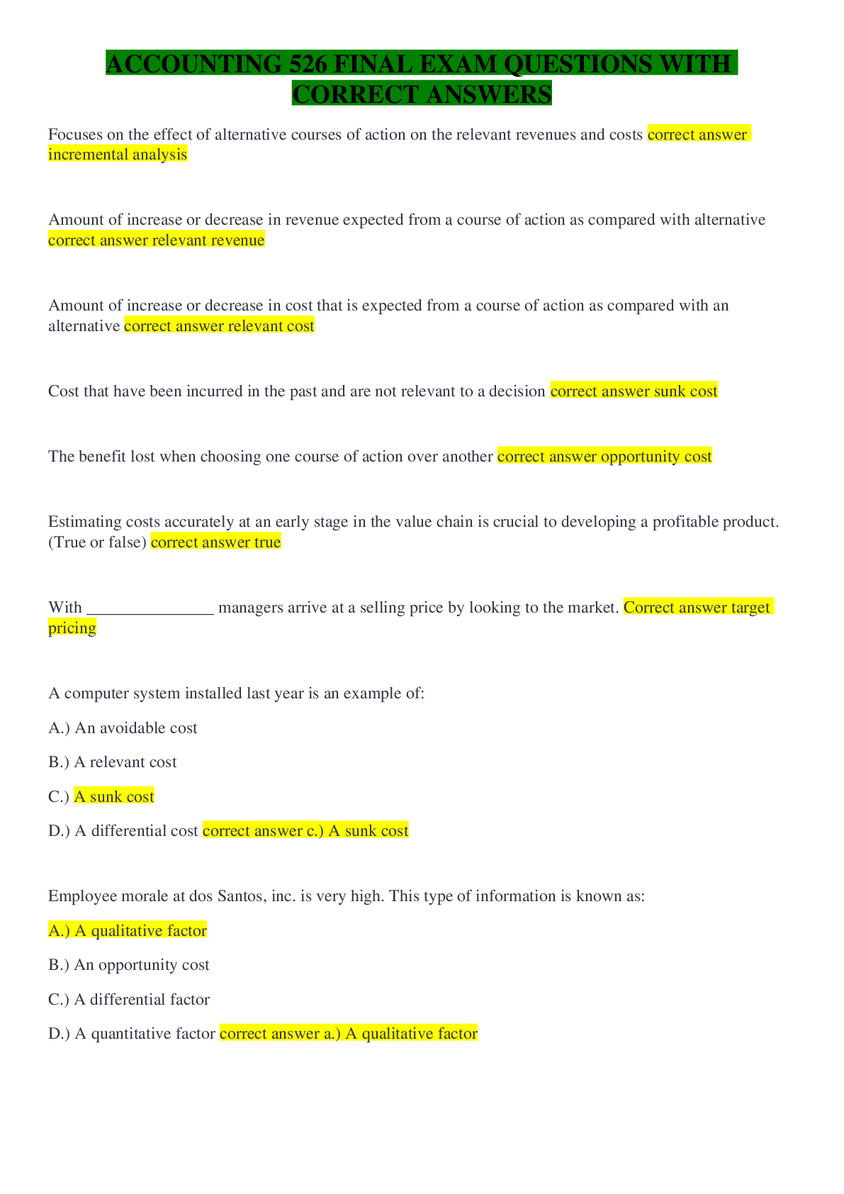 Financial Accounting > QUESTIONS & ANSWERS > ACCOUNTING 526 FINAL EXAM QUESTIONS WITH CORRECT ANSWERS (All)