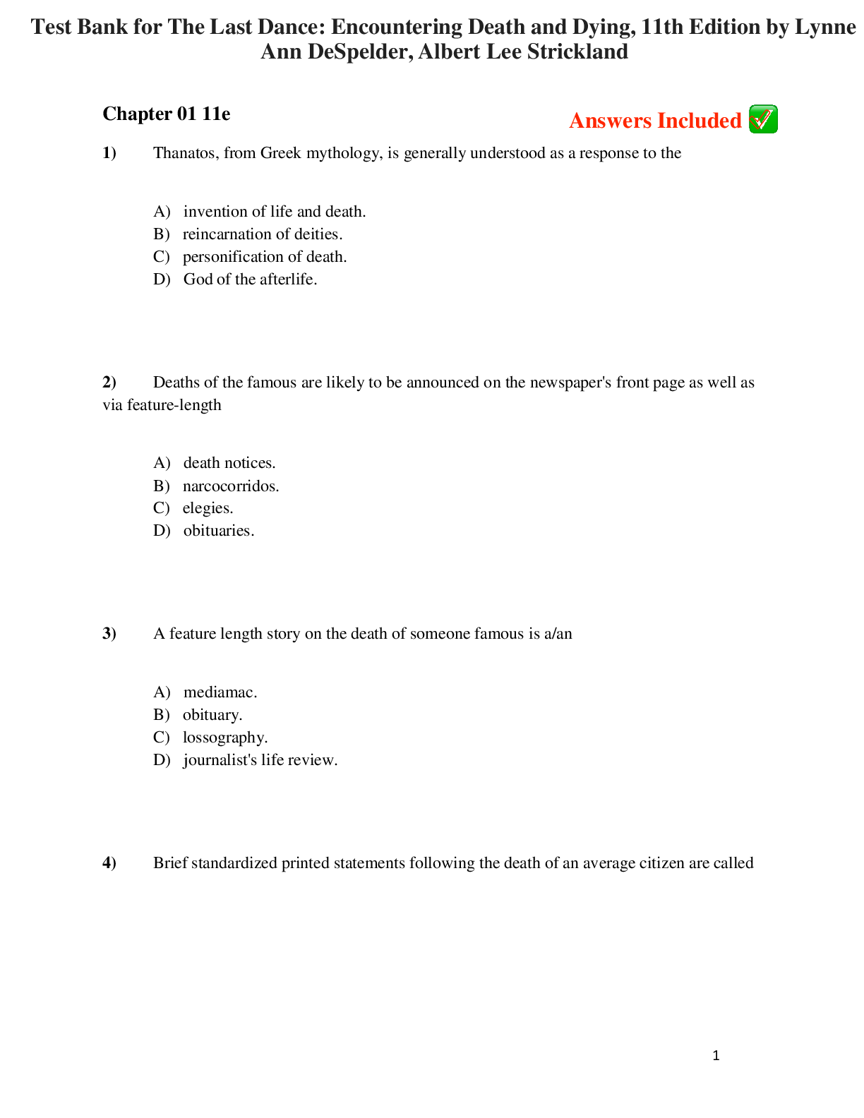 Dance 100 > TEST BANKS > Test Bank for The Last Dance: Encountering Death and Dying, 11th Edition by Lynne Ann DeSpelder, Albert Lee Strickland A+ (All)