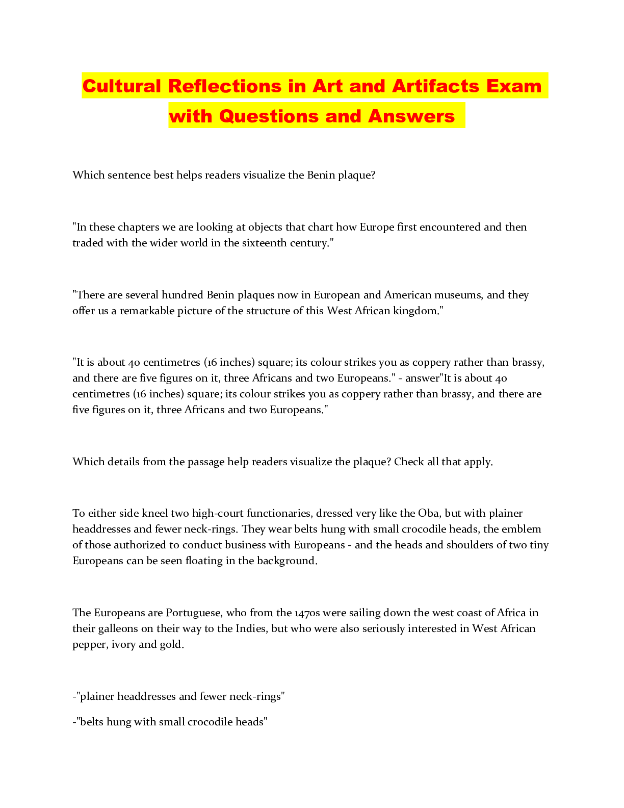Art > QUESTIONS & ANSWERS > Cultural Reflections in Art and Artifacts Exam with Questions and Answers (All)