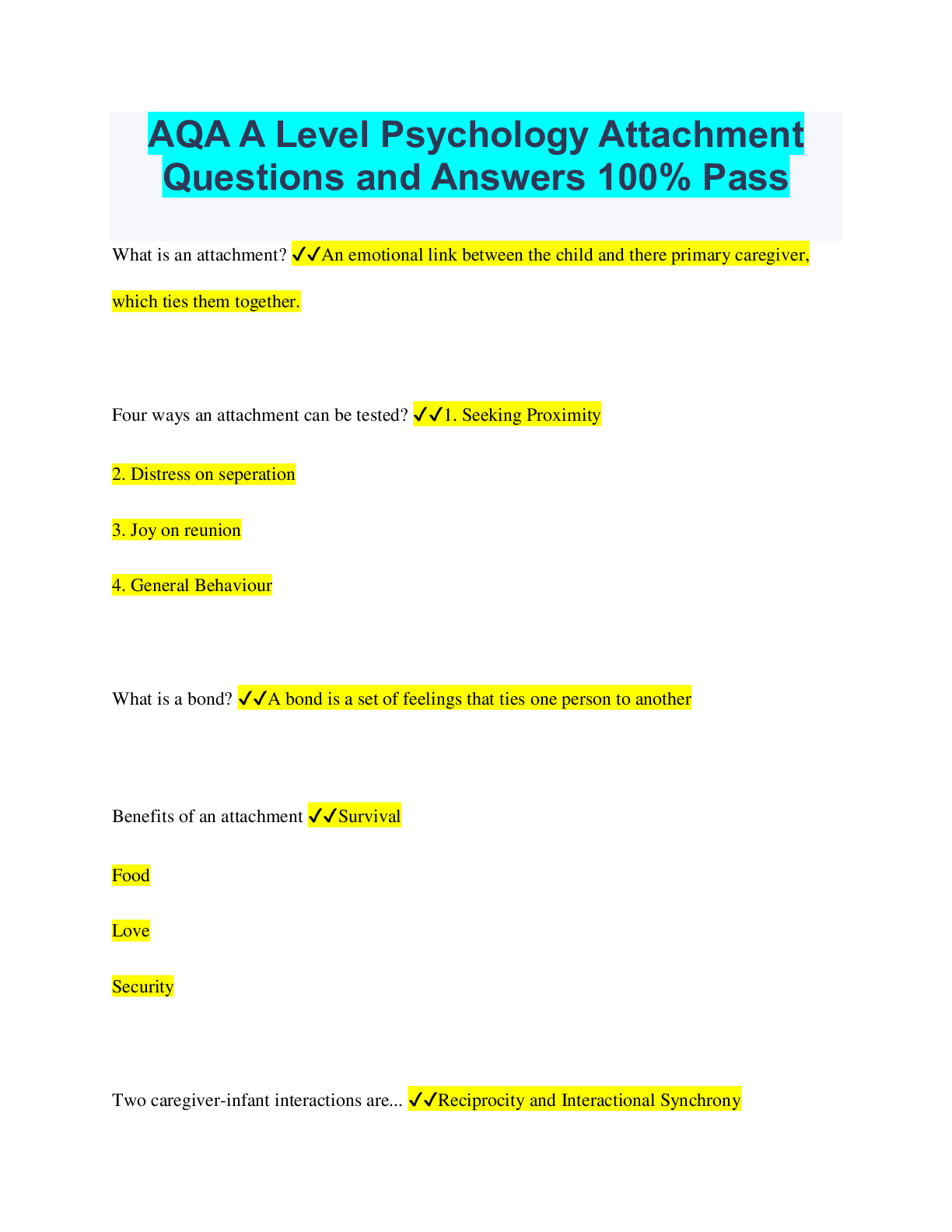 Psychology > QUESTIONS & ANSWERS > AQA A Level Psychology Attachment Questions and Answers 100% Pass (All)