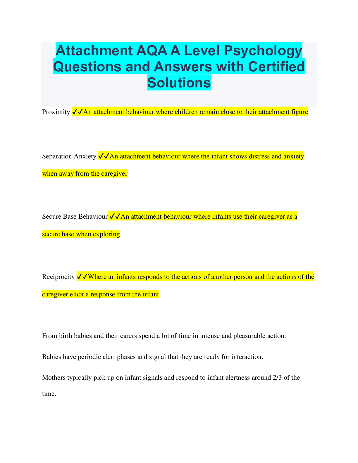 Psychology > QUESTIONS & ANSWERS > Attachment AQA A Level Psychology Questions and Answers with Certified Solutions (All)