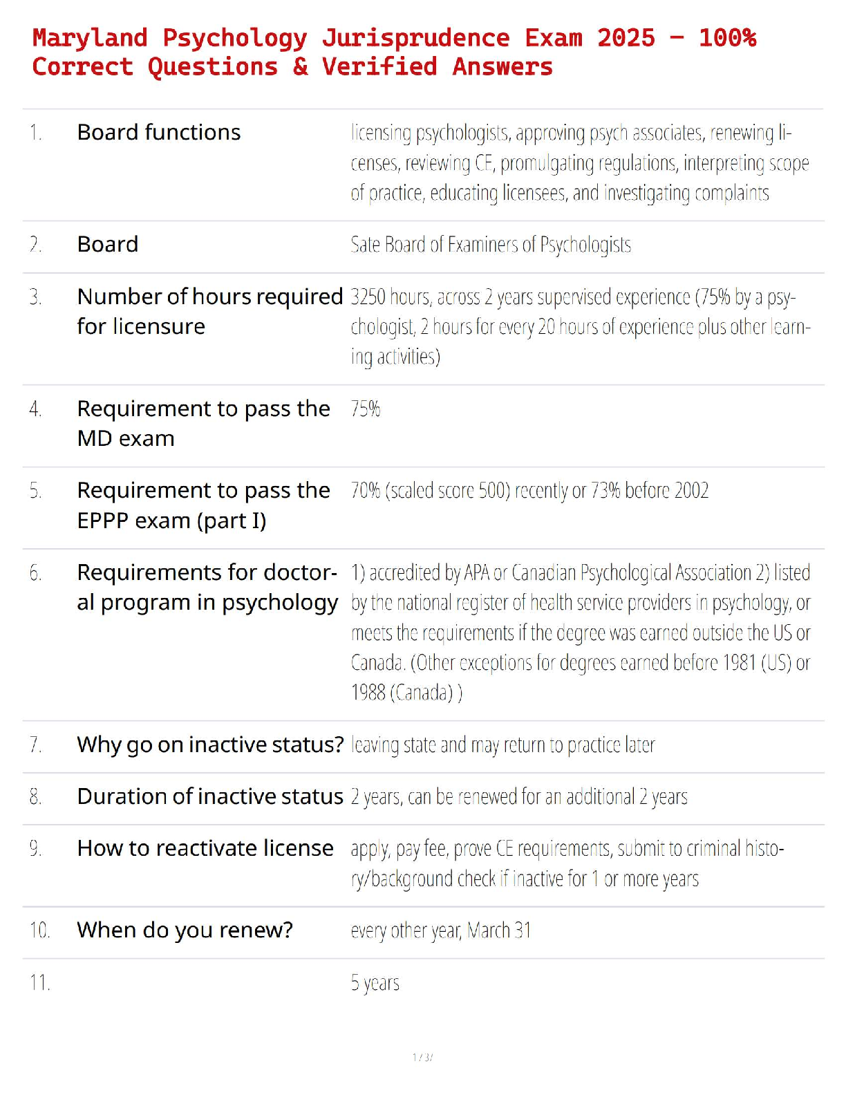 Psychology > QUESTIONS & ANSWERS > Maryland Psychology Jurisprudence Exam 2025 – 100% Correct Questions & Verified Answers (All)