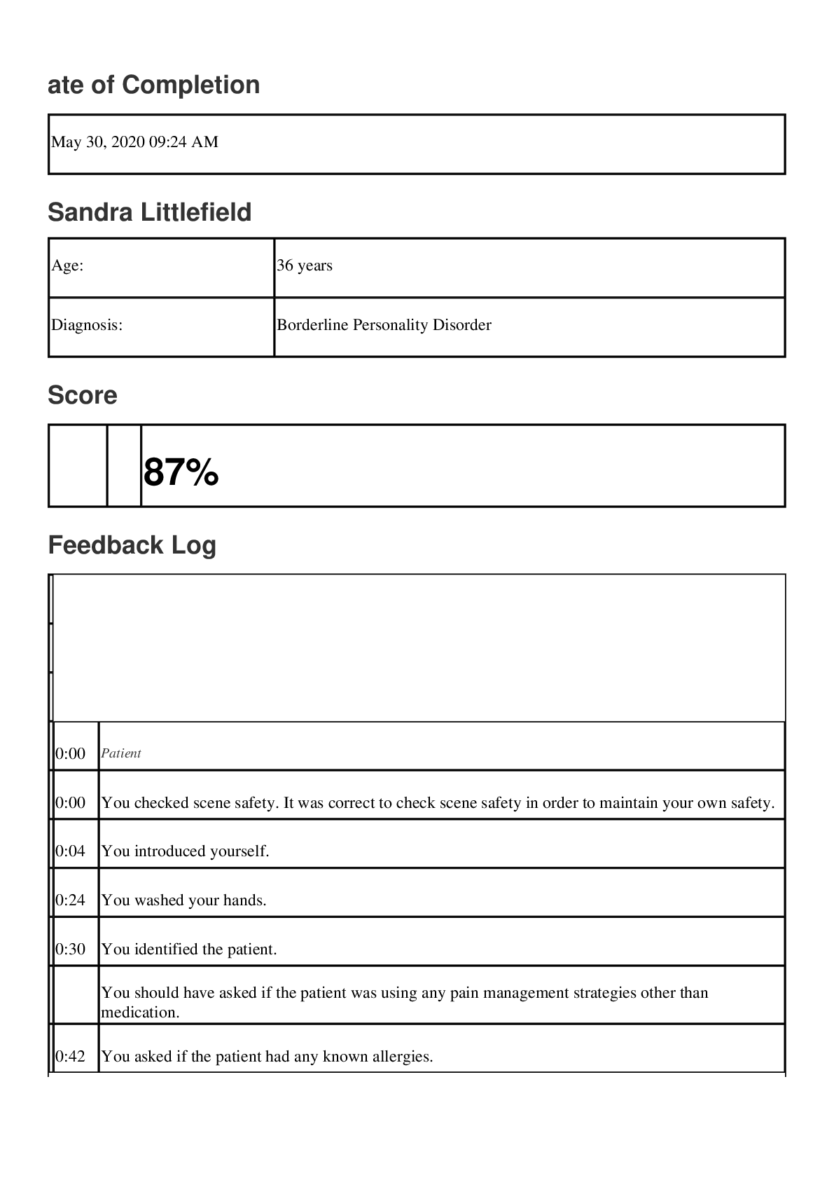 Psychology > CASE STUDY > VSIM FEEDBACK LOG - MENTAL HEALTH CASE - SHARON COLE (31 YEARS) DIAGNOSIS: DIPOLAR DISORDER (All)