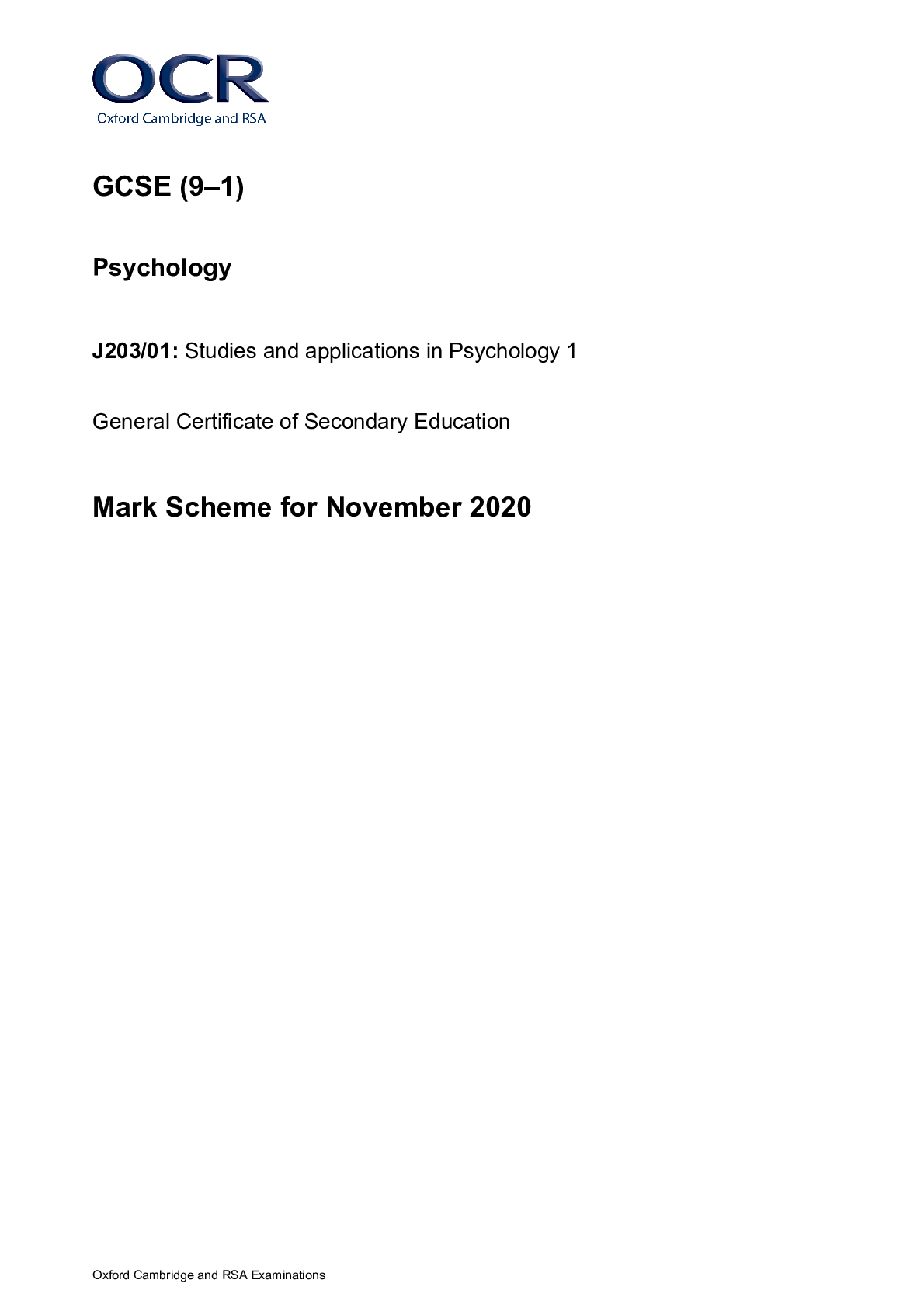 Psychology > MARK SCHEMES > GCSE (9–1) Psychology J203/01: Studies and applications in Psychology 1 General Certificate of Secondary Education Mark Scheme for November 2020 (All)