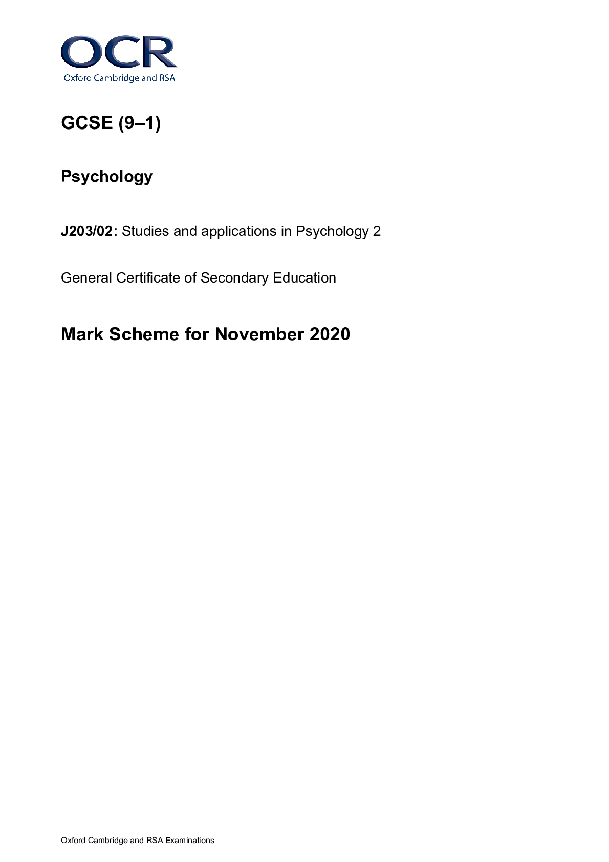 Psychology > MARK SCHEMES > GCSE (9–1) Psychology J203/02: Studies and applications in Psychology 2 General Certificate of Secondary Education Mark Scheme for November 2020 (All)