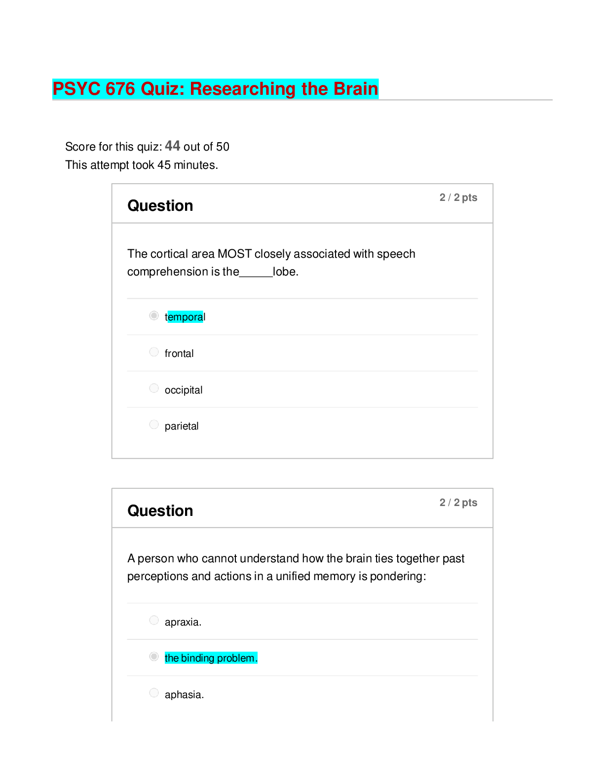 Psychology > EXAM > PSYC 676 Quiz: Researching the Brain | 25 Questions and Answers (All)