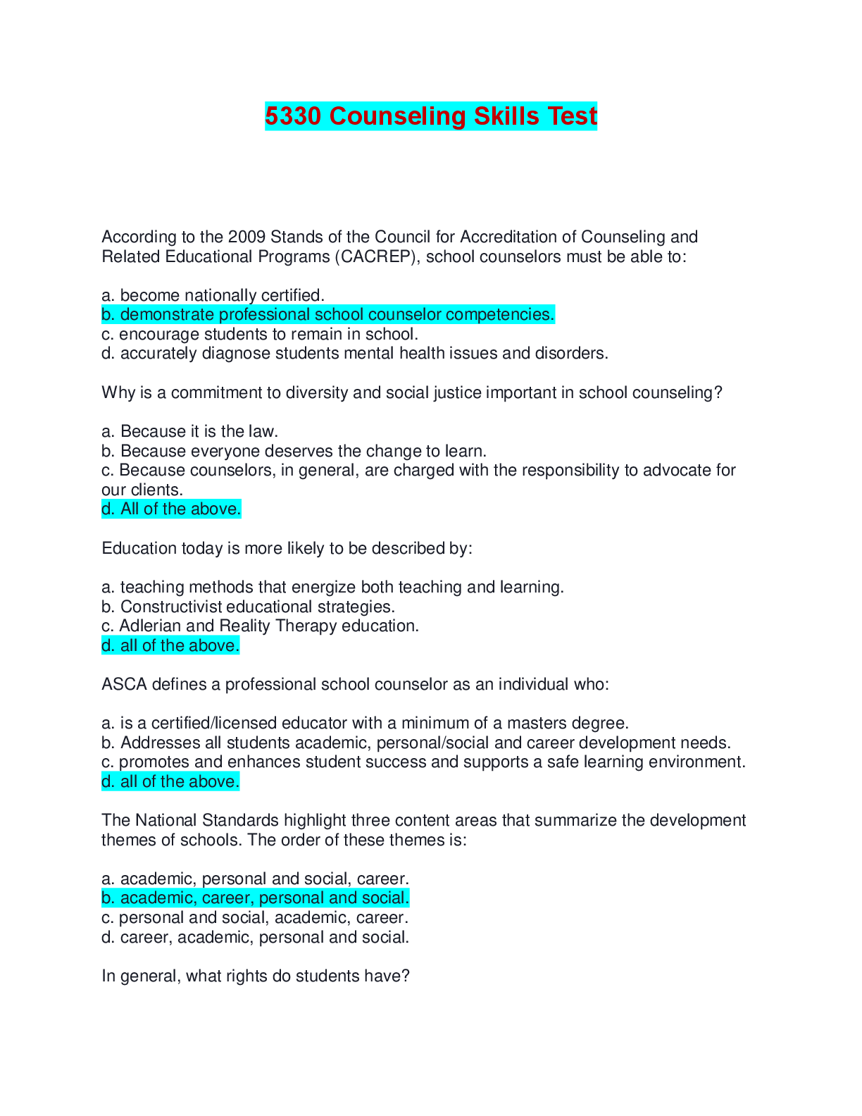 Psychology > EXAM > 5330 Counseling Skills Test | Complete Solutions (Verified Answers) (All)