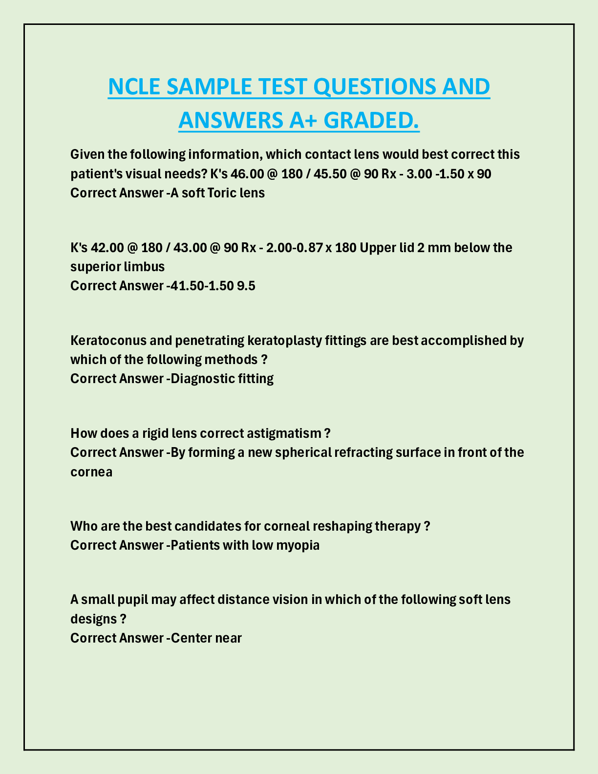 Physics > EXAM > NCLE SAMPLE TEST QUESTIONS AND ANSWERS A+ GRADED. (All)
