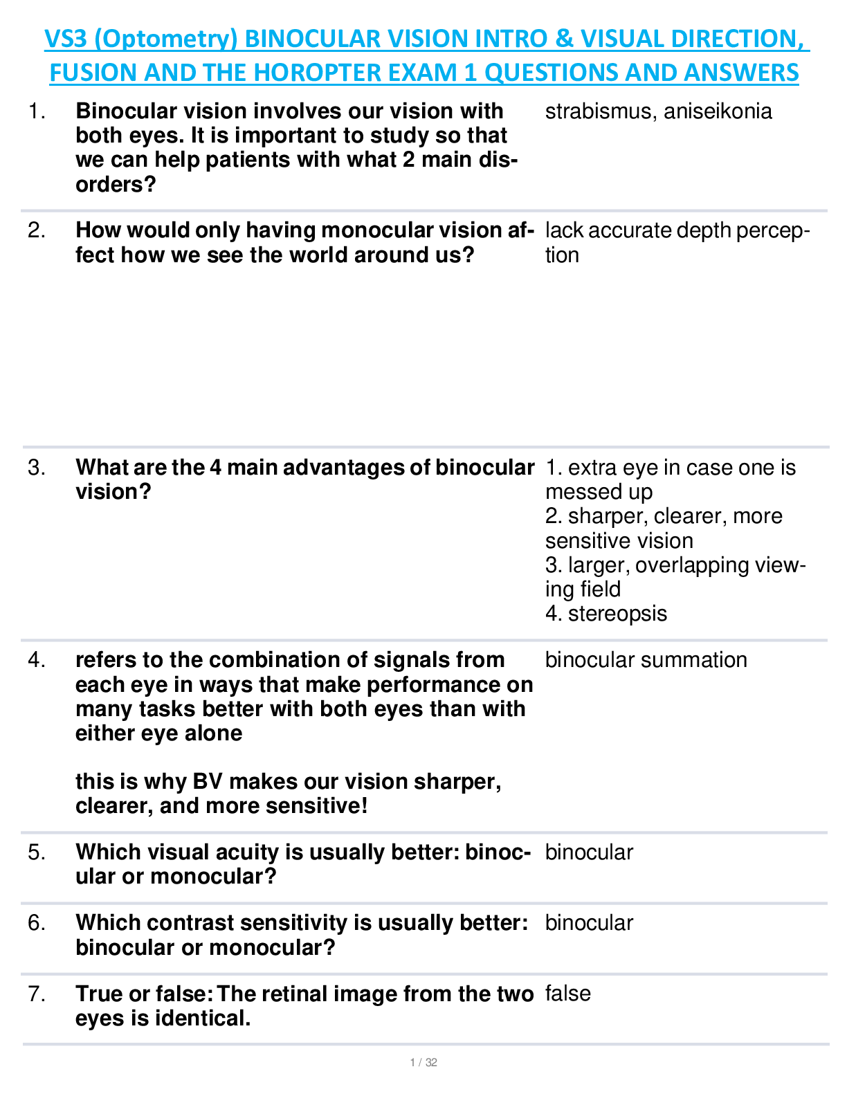 Physics > EXAM > VS3 (Optometry) BINOCULAR VISION INTRO & VISUAL DIRECTION, FUSION AND THE HOROPTER EXAM 1 QUESTIONS AND ANSWERS (All)