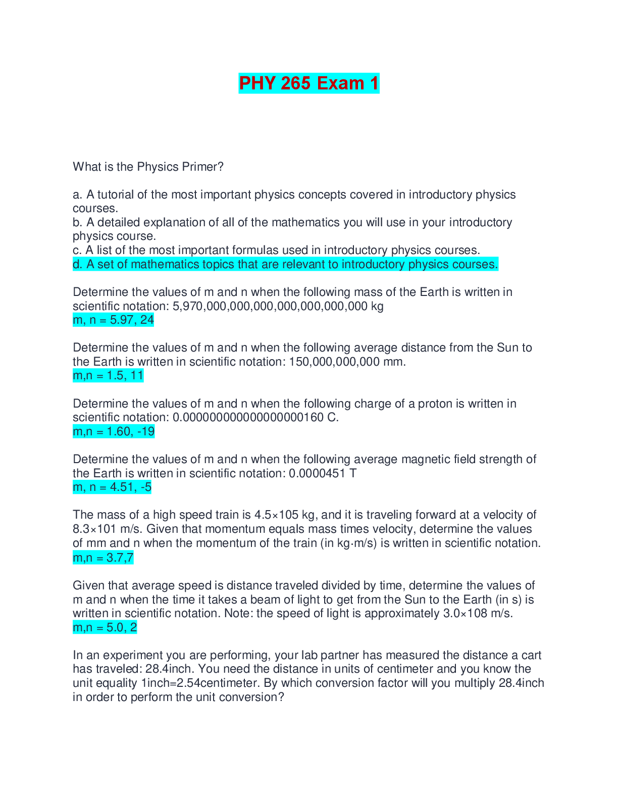 Physics > EXAM > PHY 265 Exam 1 | Questions with Verified Answers (All)