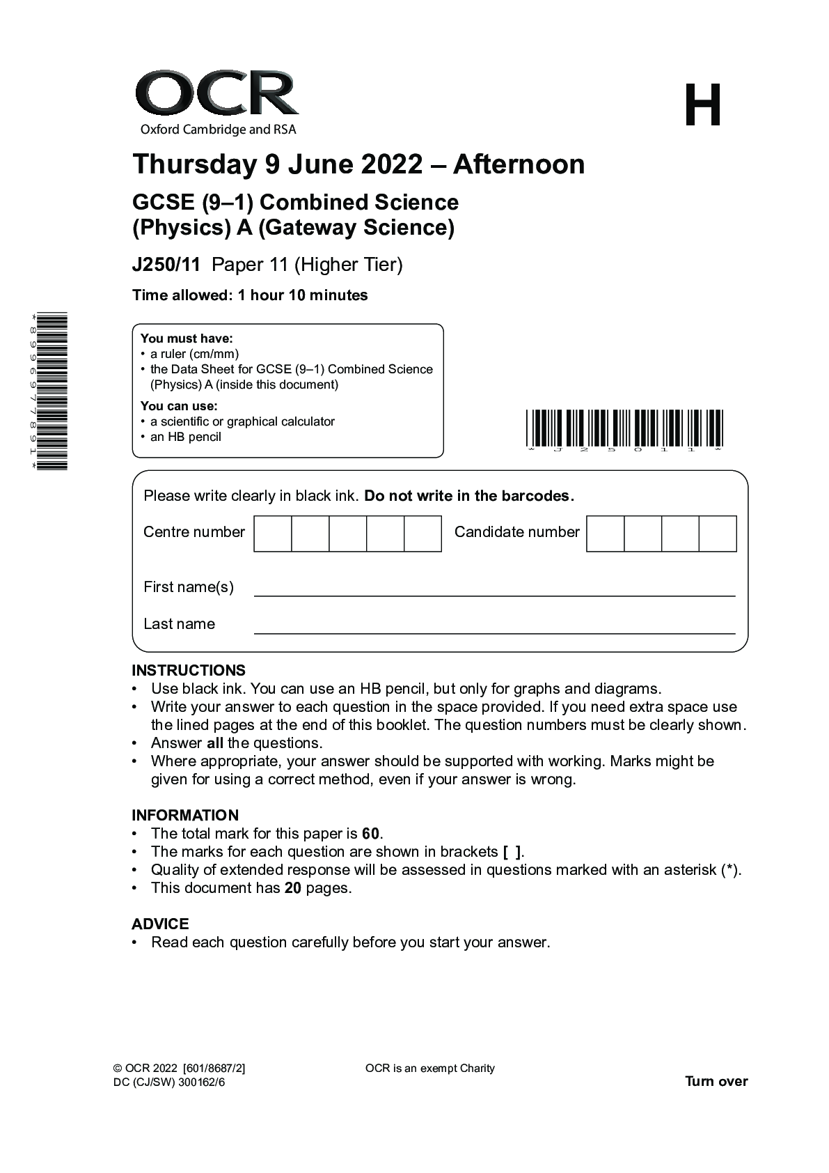 Physics > QUESTION PAPER (QP) > OCR Oxford and RSA Thursday 9 June 2022 — Afternoon GCSE (9—1) Combined Science (Physics) A (Gateway Science) J250/11 Paper 11 (Higher Tier) Time allowed: 1 hour 10 minutes (All)