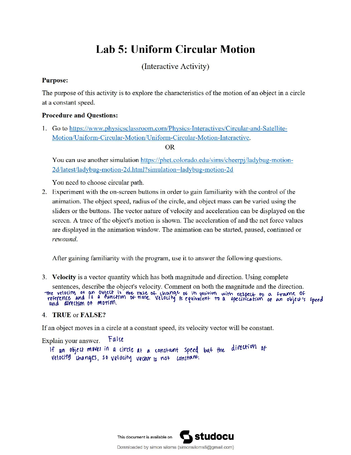 Physics > QUESTIONS & ANSWERS > Physics 205 / Lab 5 – Uniform Circular Motion / Score 100% Lab Report Guide & 2025 Update (All)