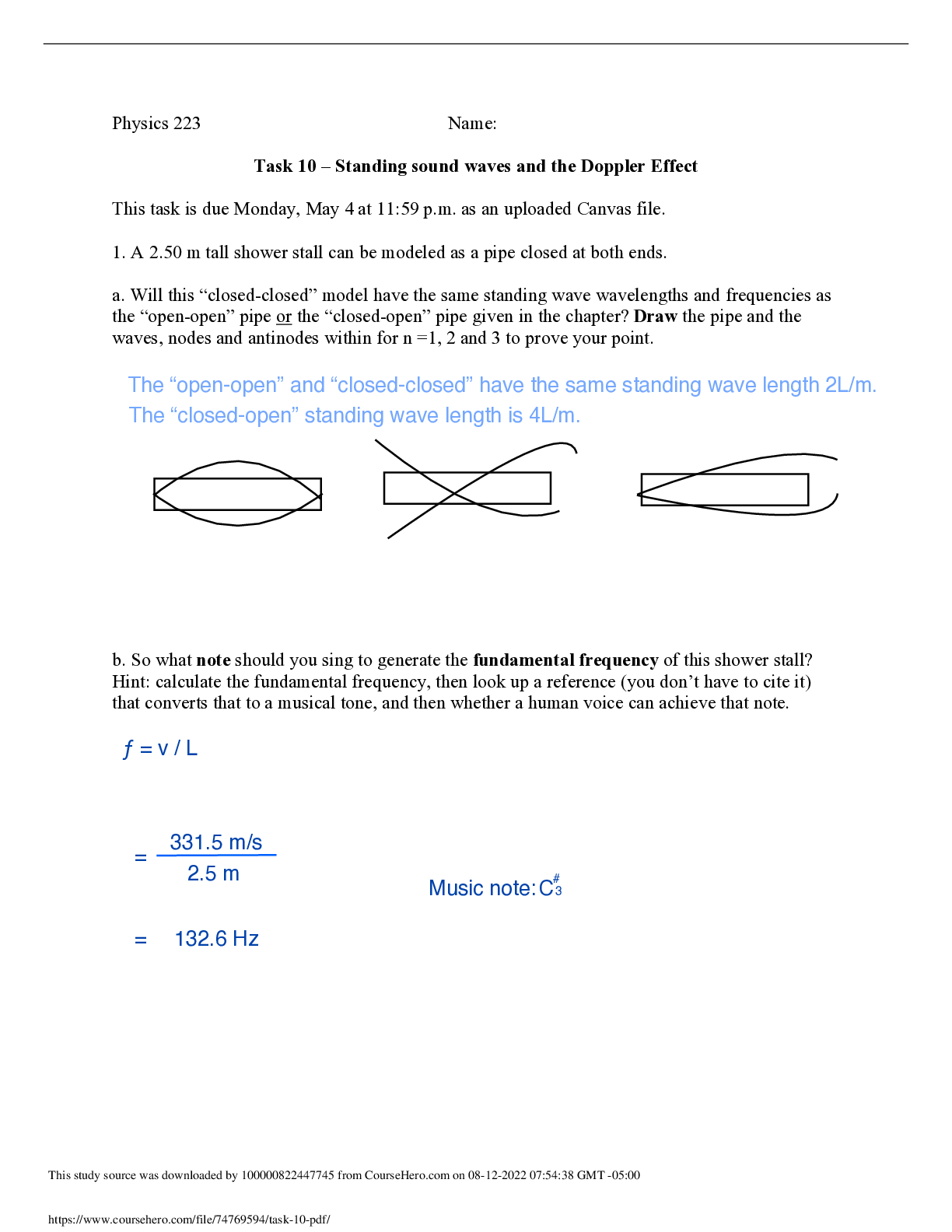 Physics > QUESTIONS & ANSWERS > North Seattle College: Physics 223 Name: Task 10 – Standing sound waves and the Doppler Effect (All)