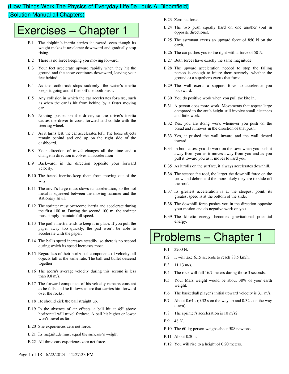 Physics > SOLUTIONS MANUAL > How Things Work The Physics of Everyday Life 5e Louis A. Bloomfield (Solution Manual) (All)