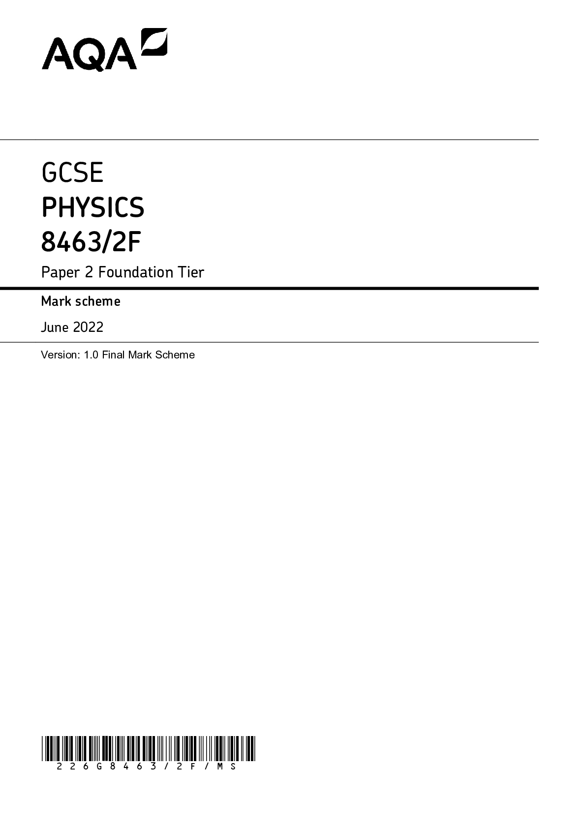 Physics > MARK SCHEMES > GCSE PHYSICS 8463/2F Paper 2 Foundation Tier Mark scheme June 2022 Version: 1.0 Final Mark Scheme *226G8463/2f/MS* MARK SCHEME – GCSE PHYSICS – 8463/2F – JUNE 2022 2 (All)