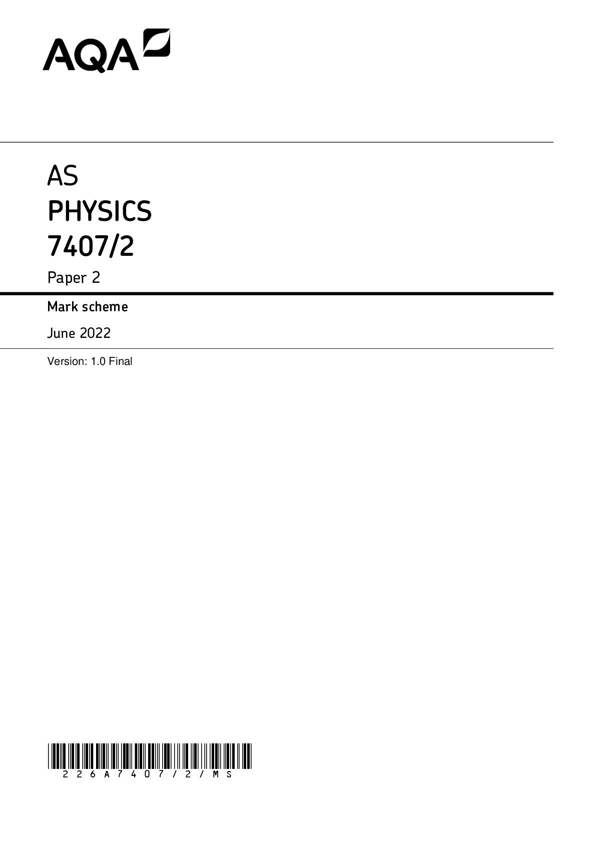 Physics > AS Level Mark Scheme > AS PHYSICS 7407/2 Paper 2 Mark scheme June 2022 Version: 1.0 Final *226A7407/2/MS* MARK SCHEME – AS PHYSICS – 7407/2 – JUNE 2022 2 (All)