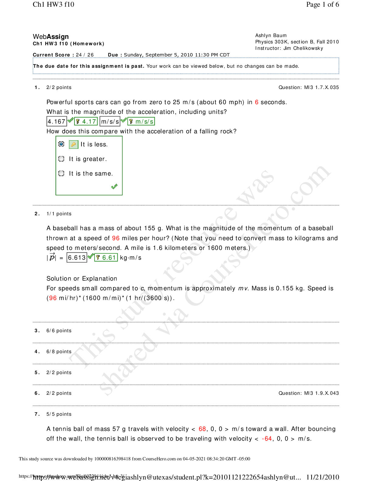 Physics > QUESTIONS & ANSWERS > University of Texas - PHY 56665ch 1 hw 3 (All)