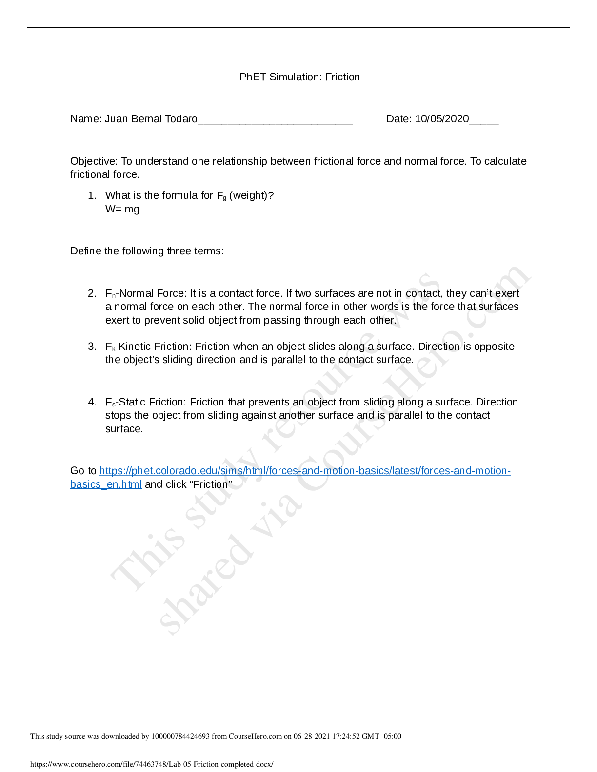 Physics > QUESTIONS & ANSWERS > PhET Simulation: Friction Broward CollegePHYSICS 2053LLab 05 - Friction, completed (All)