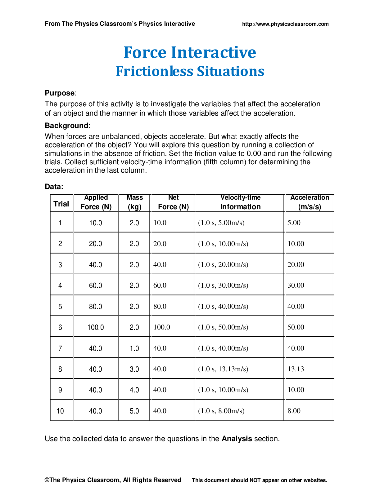 Physics > QUESTIONS & ANSWERS > The Physics Classroom’s Physics Interactive/ Force Interactive Frictionless Situations (All)
