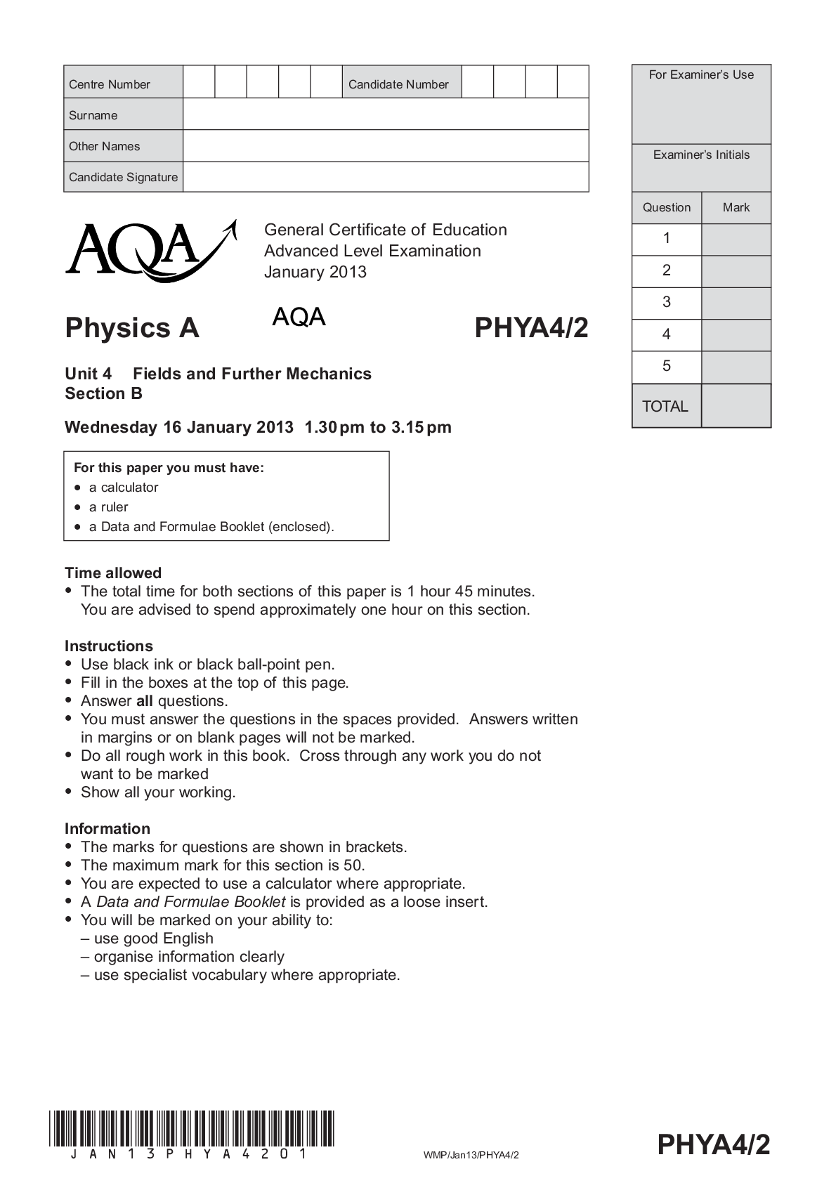 Physics > EXAM > Physics A PHYA4/2 Unit 4 Fields and Further Mechanics Section B (All)
