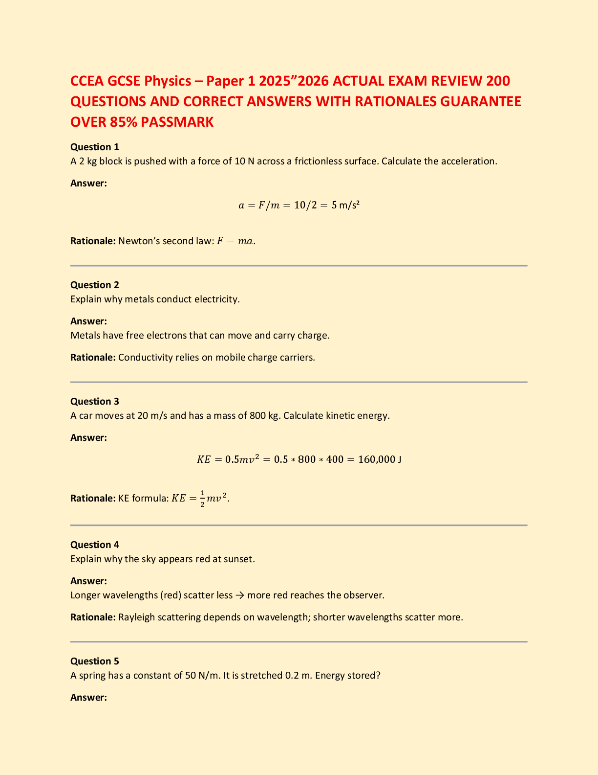 Physics > EXAM > CCEA GCSE Physics – Paper 1 2025”2026 ACTUAL EXAM REVIEW 150 QUESTIONS AND CORRECT ANSWERS WITH RATIONALES COVEING THE MOST TESTED QUESTIONS GUARANTEE OVER 80 PERCENTAGE PASSMARK (All)