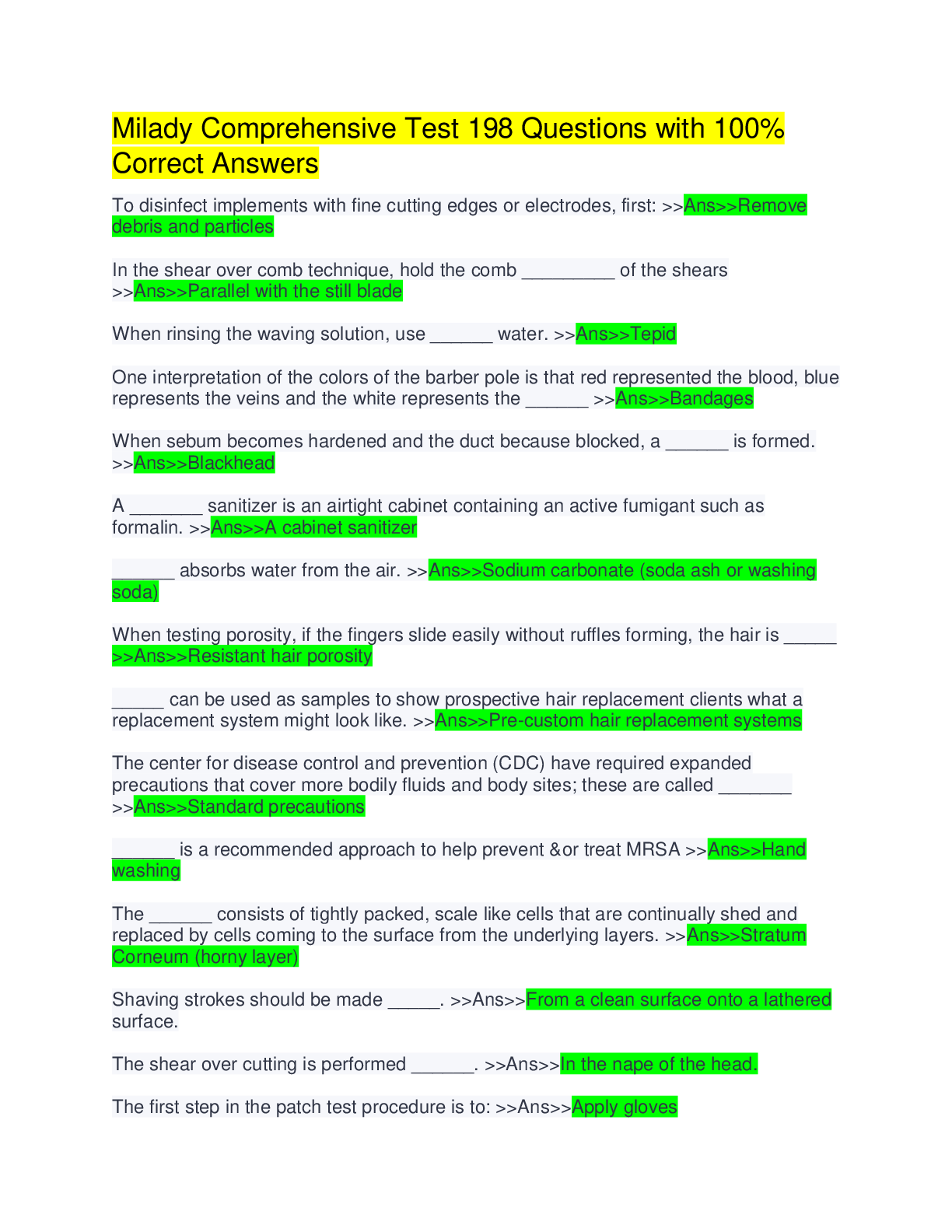 Physics > QUESTIONS & ANSWERS > Milady Comprehensive Test 198 Questions with 100% Correct Answers (All)
