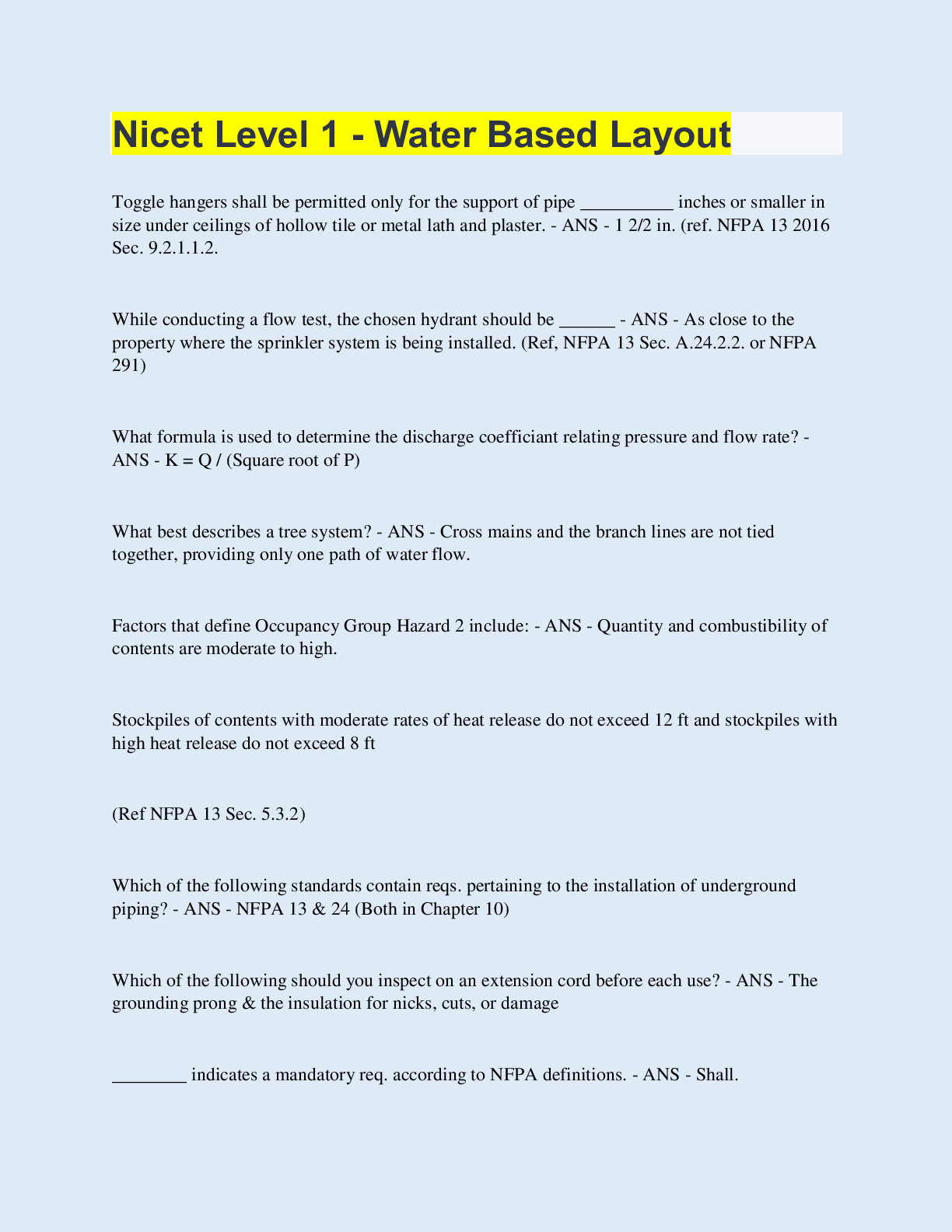 Physics > EXAM > Nicet Level 1 water based systems | 50 Questions with 100% Correct Answers | Updated & Verified (All)