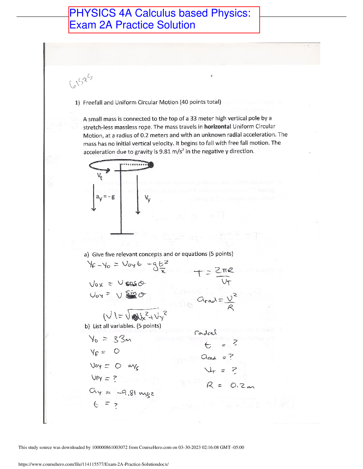 Physics > QUESTIONS & ANSWERS > PHYSICS 4A Calculus based Physics - Irvine Valley College_Exam 2A Practice Solution (All)