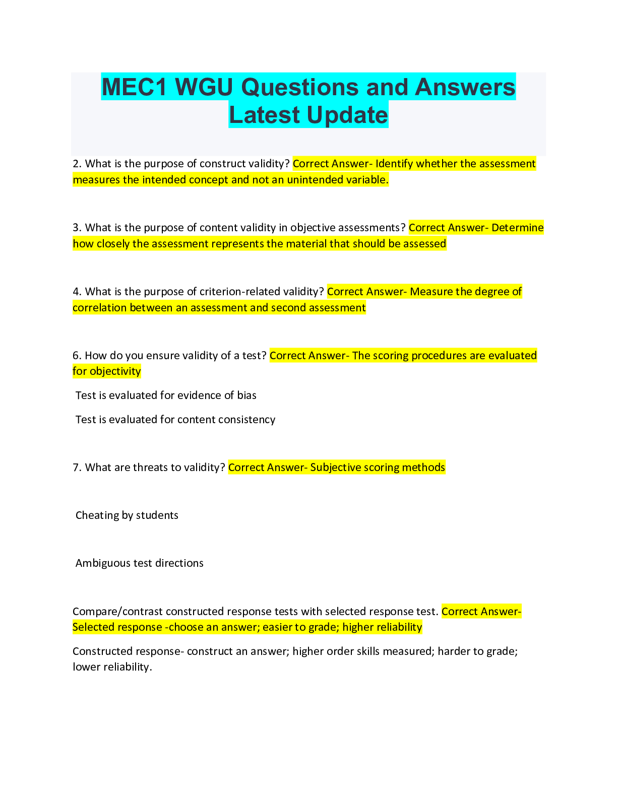 Statistics > QUESTIONS & ANSWERS > MEC1 WGU Questions and Answers Latest Update (All)