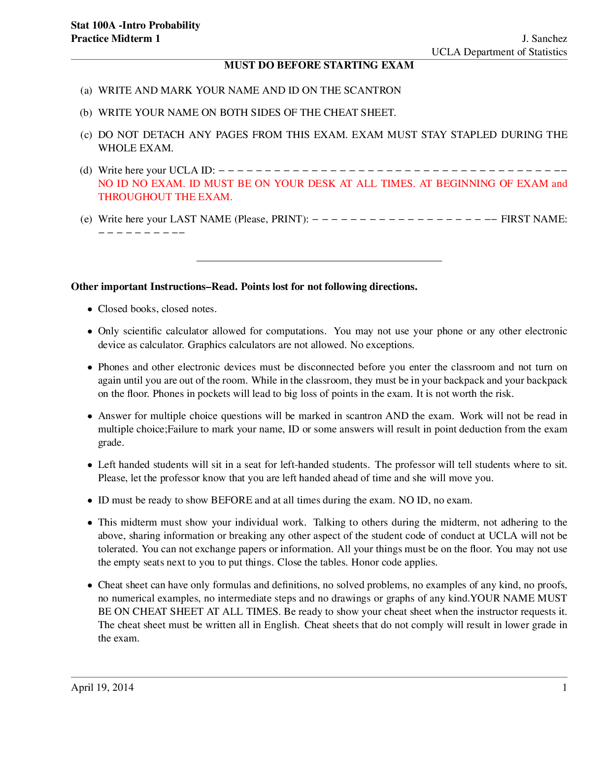 Statistics > EXAM > FINAL EXAM FOR STATS 100Amidterm1pspring14-ALL ANWERS CORRECT (All)