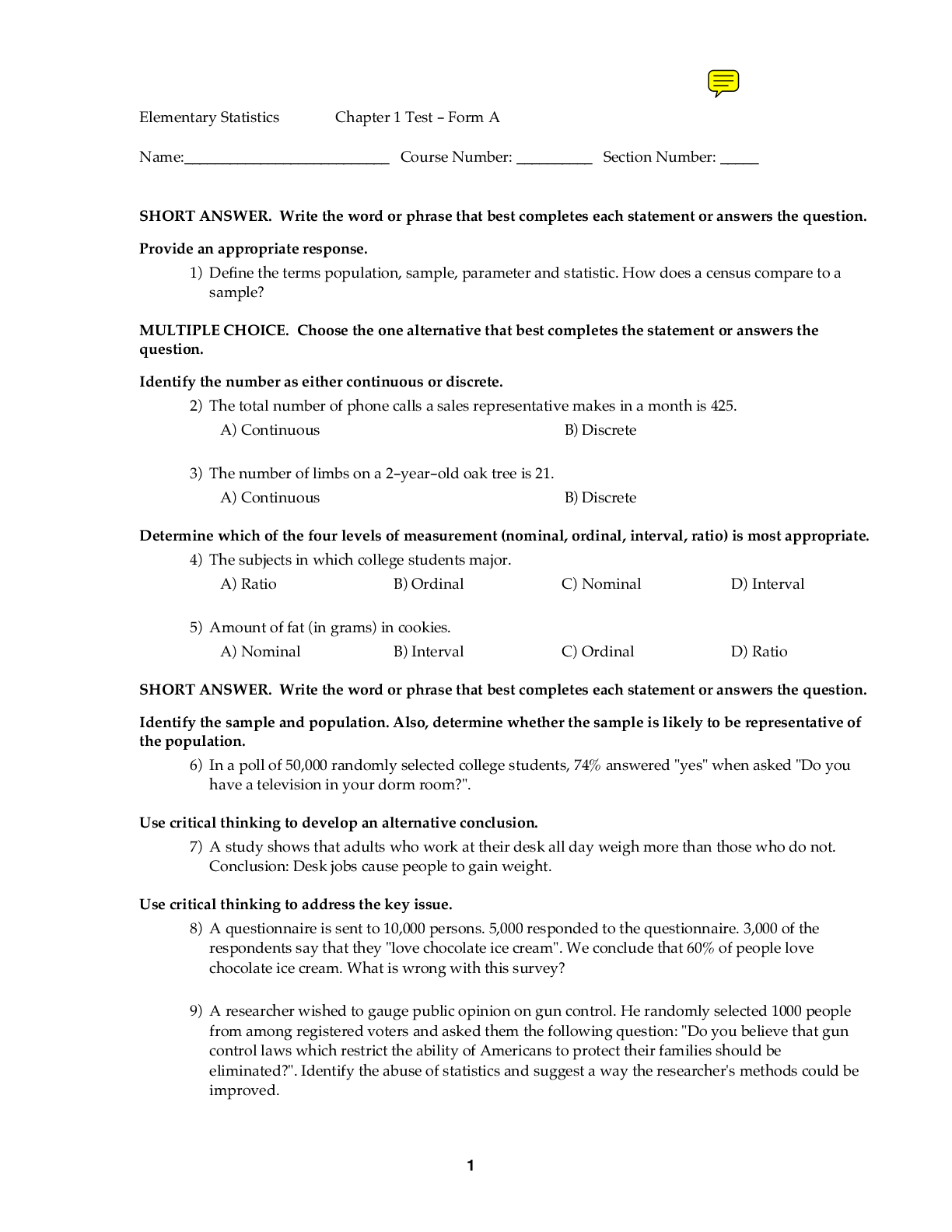 Statistics > Final Exam Review > statistics final exam - Part 1 of 9 1.0 1.0 Points Question with 100% correct answers, (All)