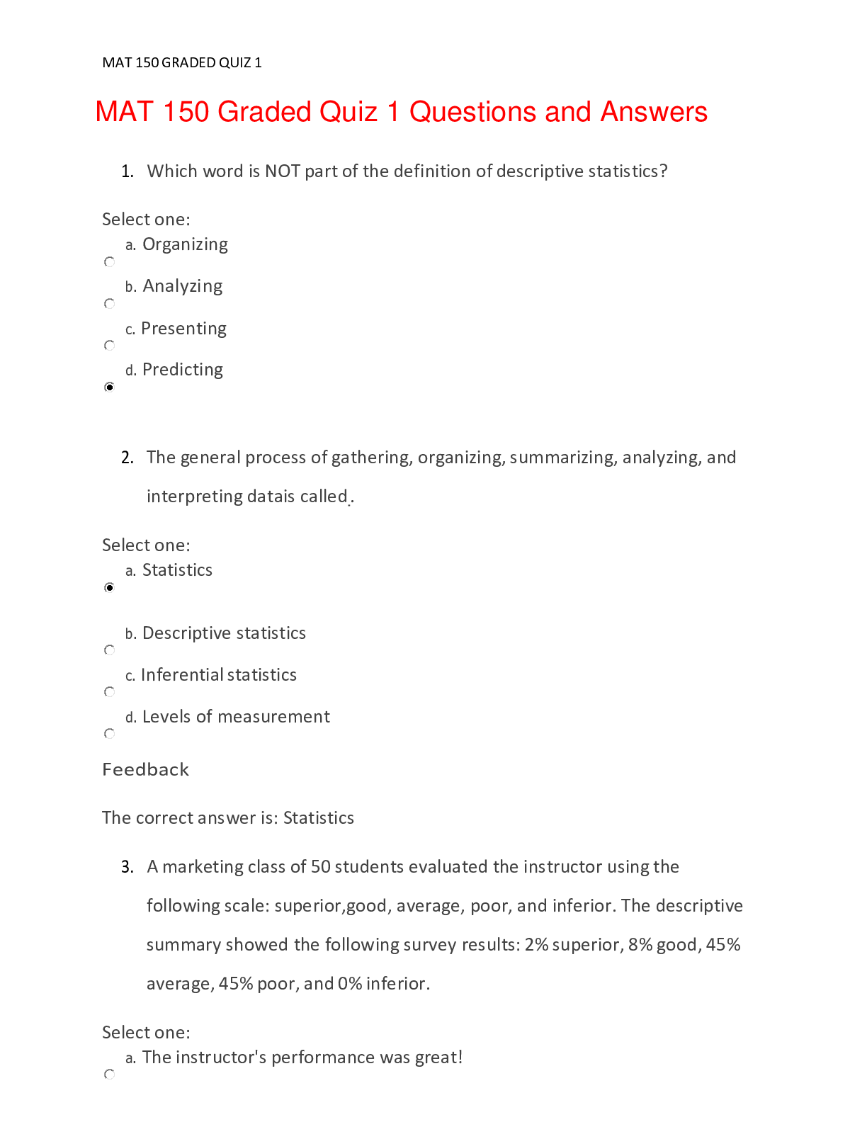 Statistics > EXAM > MAT 150 Quiz and Answers 1-4_LATEST,100% CORRECT (All)