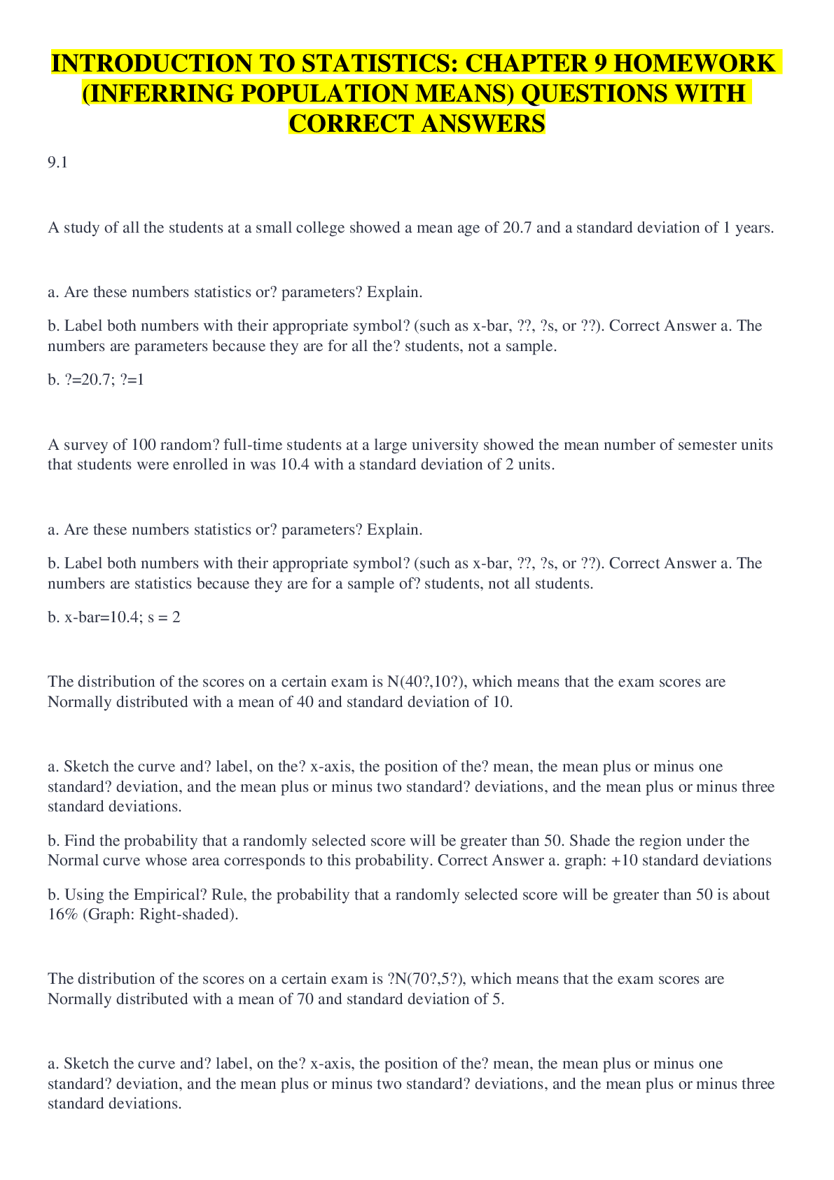 Statistics > QUESTIONS & ANSWERS > INTRODUCTION TO STATISTICS: CHAPTER 9 HOMEWORK (INFERRING POPULATION MEANS) QUESTIONS WITH CORRECT ANSWERS (All)