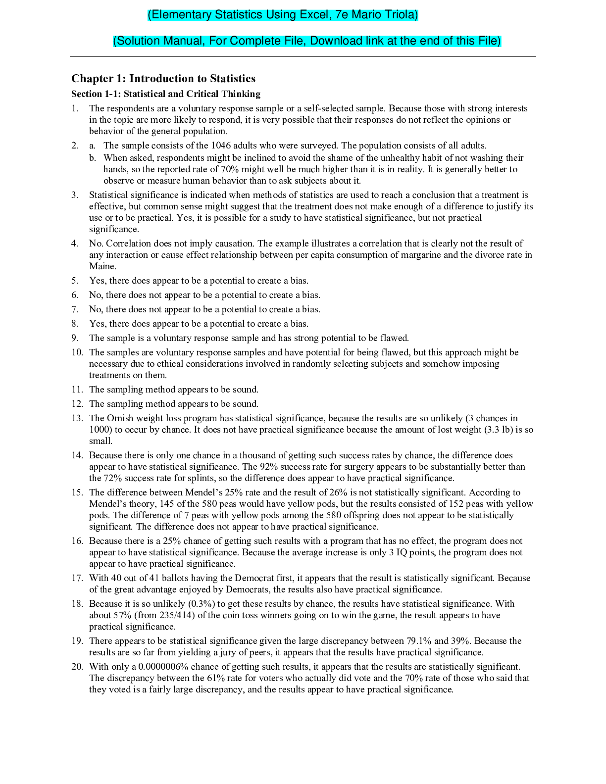 Statistics > SOLUTIONS MANUAL > Elementary Statistics Using Excel, 7e Mario Triola (Solution Manual) (All)