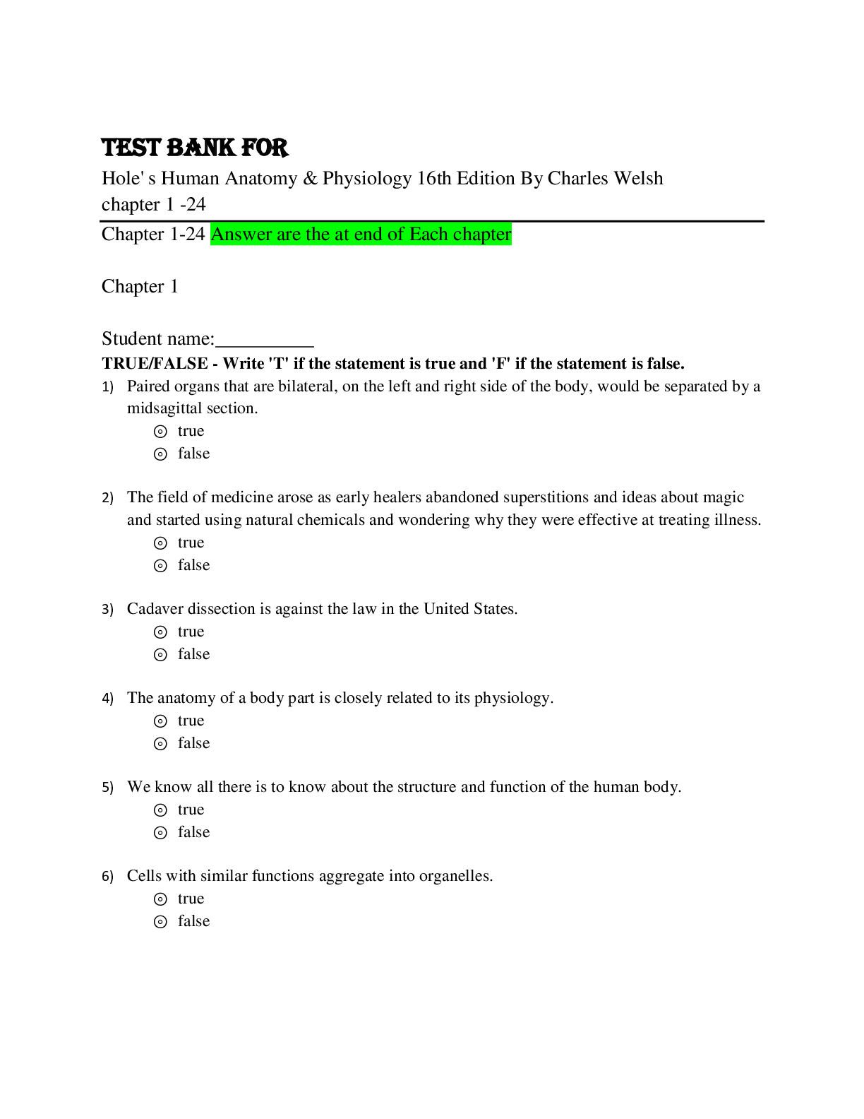 Anatomy > TEST BANKS > Test Bank for Hole's Human Anatomy & Physiology 16th Edition By Charles Welsh Chapter 1-24 (All)