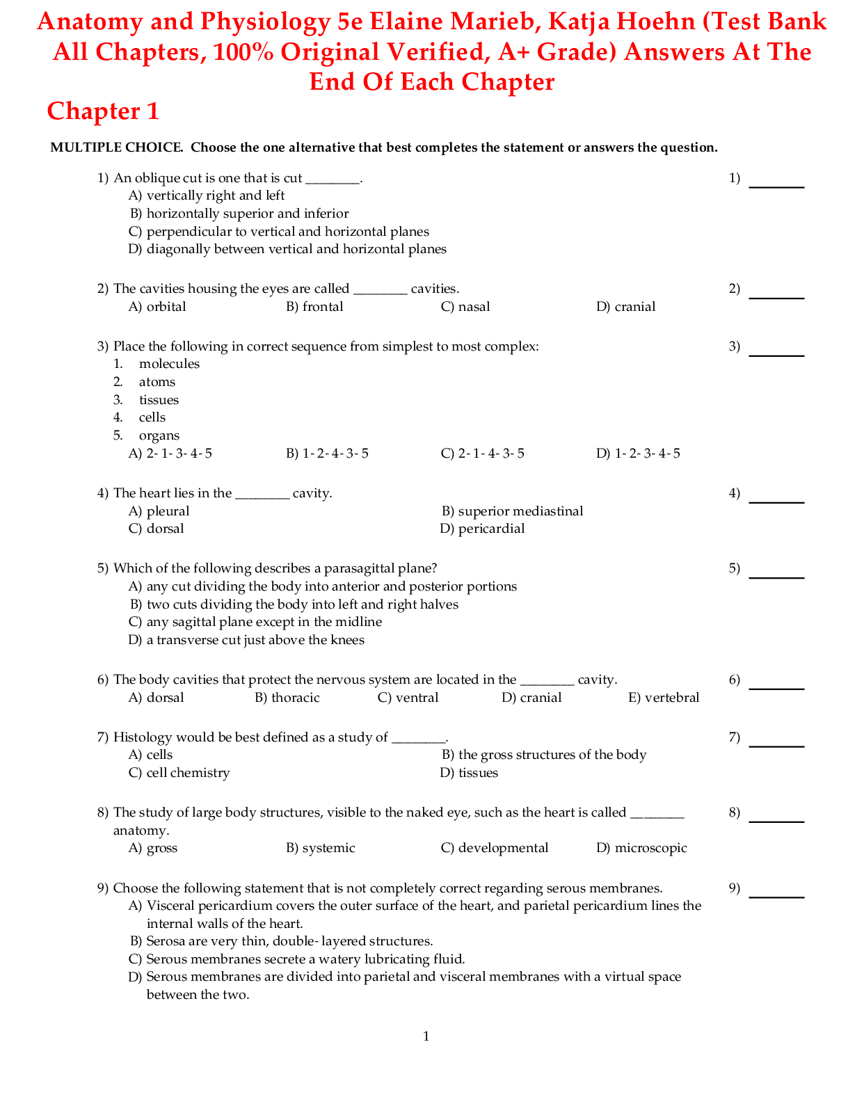 Anatomy > TEST BANKS > Test Bank For Anatomy and Physiology 5th Edition By Elaine Marieb, Katja Hoehn (All Chapters, 100% Original Verified, A+ Grade) (All)