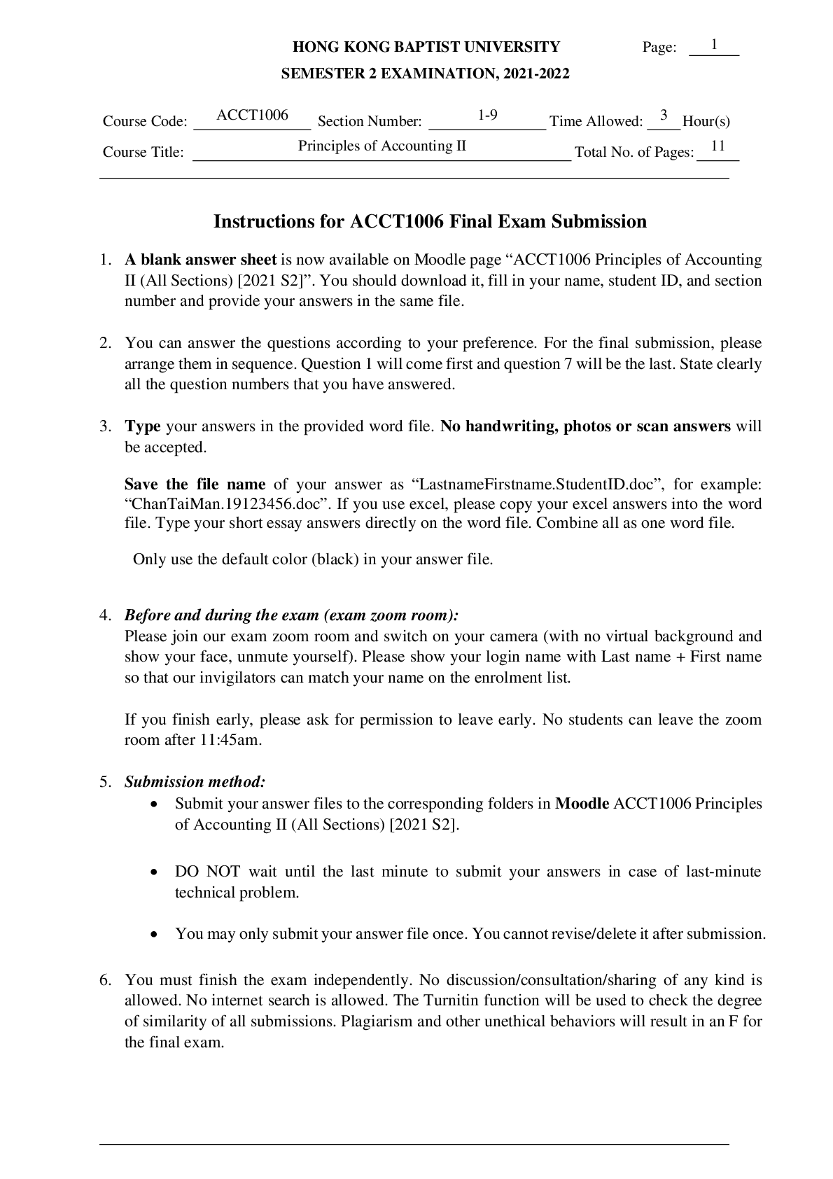 Accounting > EXAM > HONG KONG BAPTIST UNIVERSITY - SEMESTER 2 EXAMINATION, 2021-2022. ACCT1006 Final Exam Submission (All)