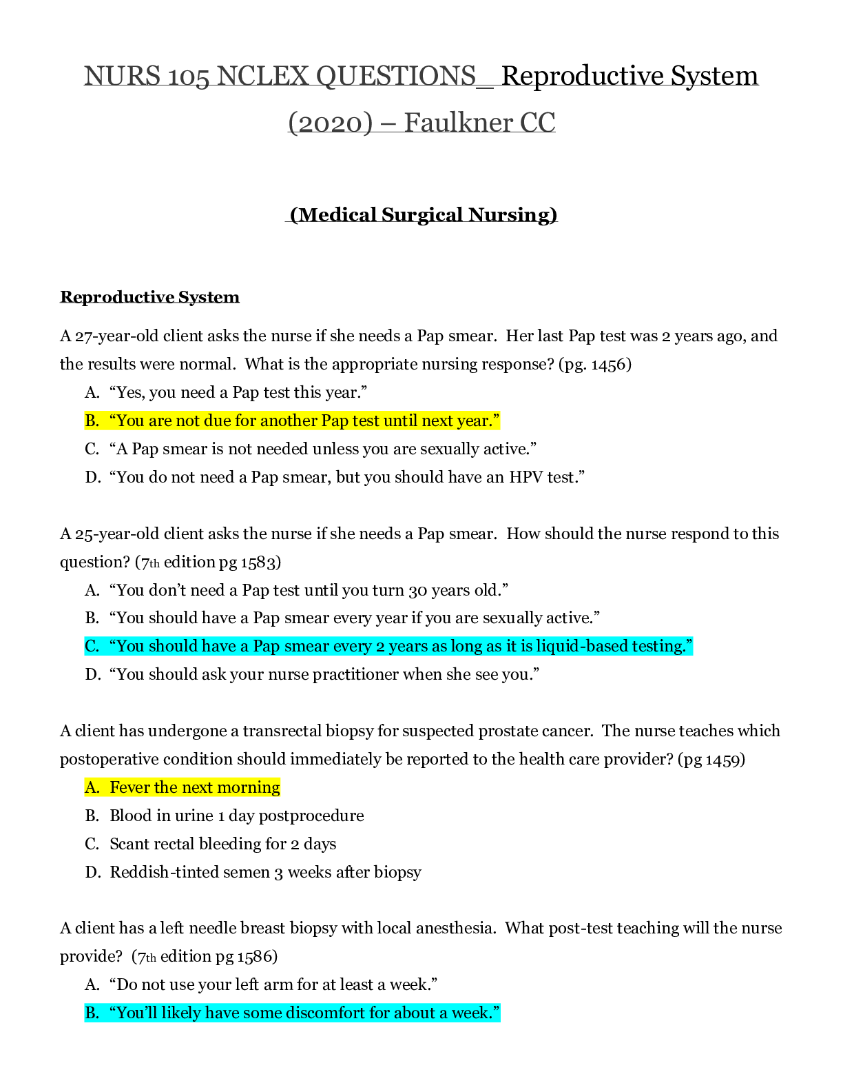 Medical Studies > EXAM > NURS 105 NCLEX QUESTIONS_ Reproductive System (2020) – Faulkner CC | NURS105 NCLEX QUESTIONS_ Reproductive System (2020) (All)
