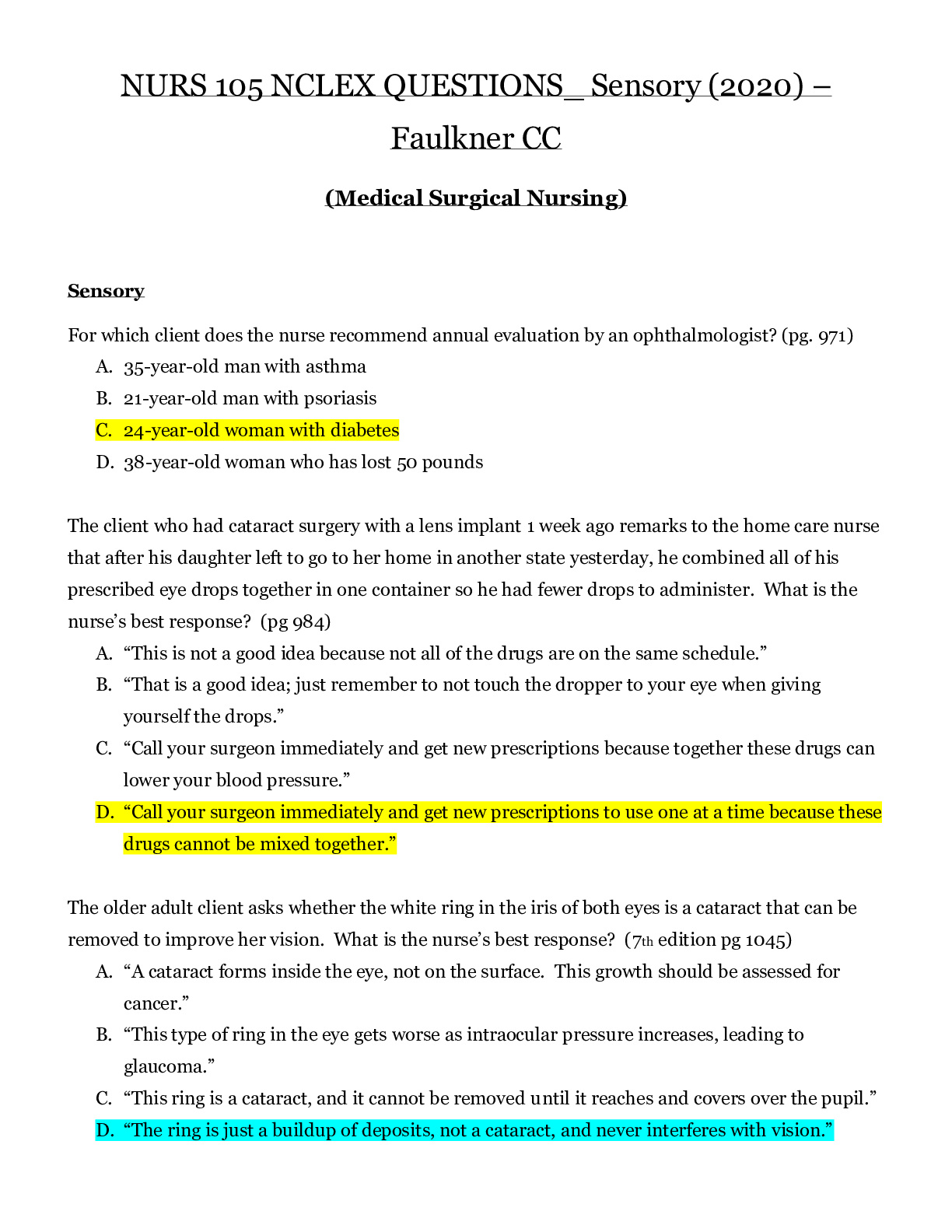 Medical Studies > EXAM > NURS 105 NCLEX QUESTIONS_ Sensory (2020) – Faulkner CC | NURS 105 NCLEX QUESTIONS_ Sensory (2020) (All)